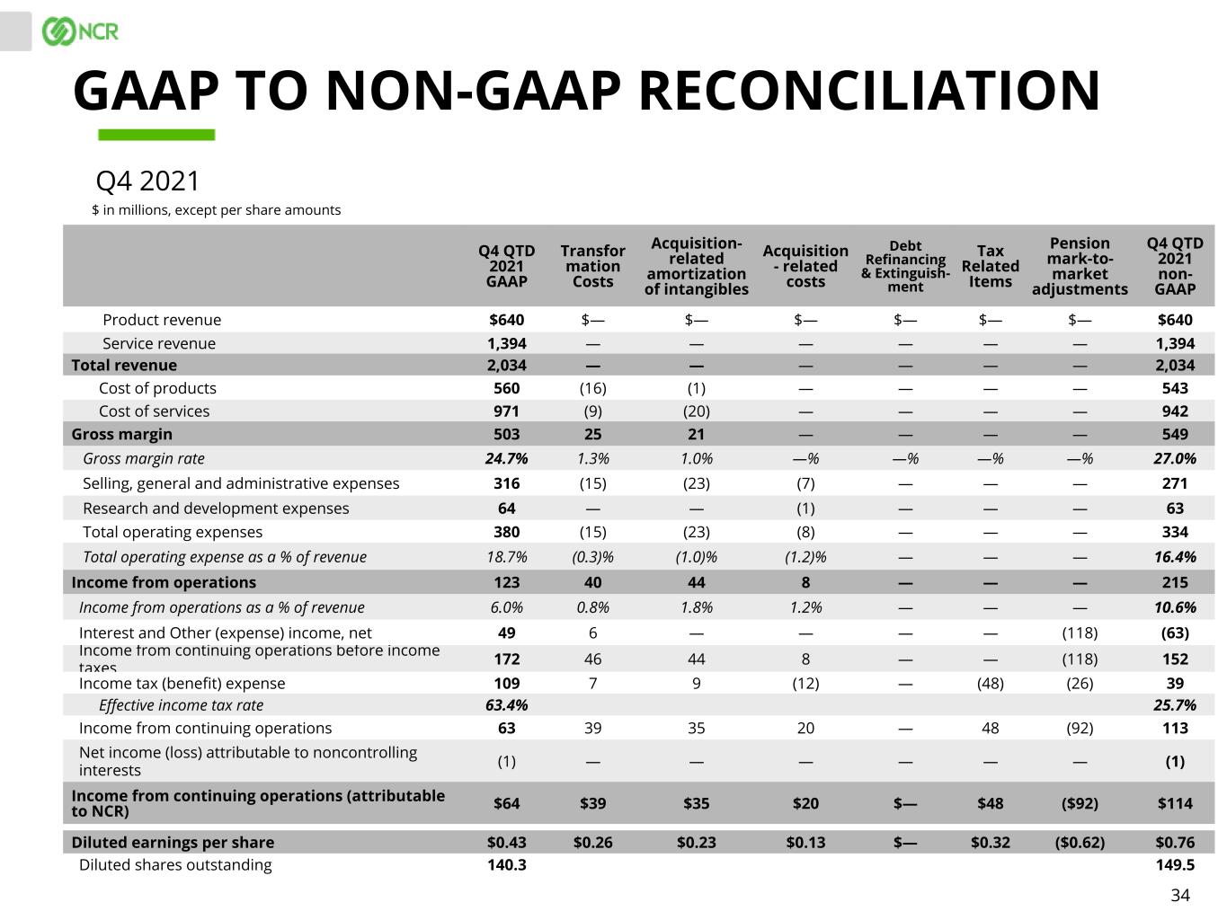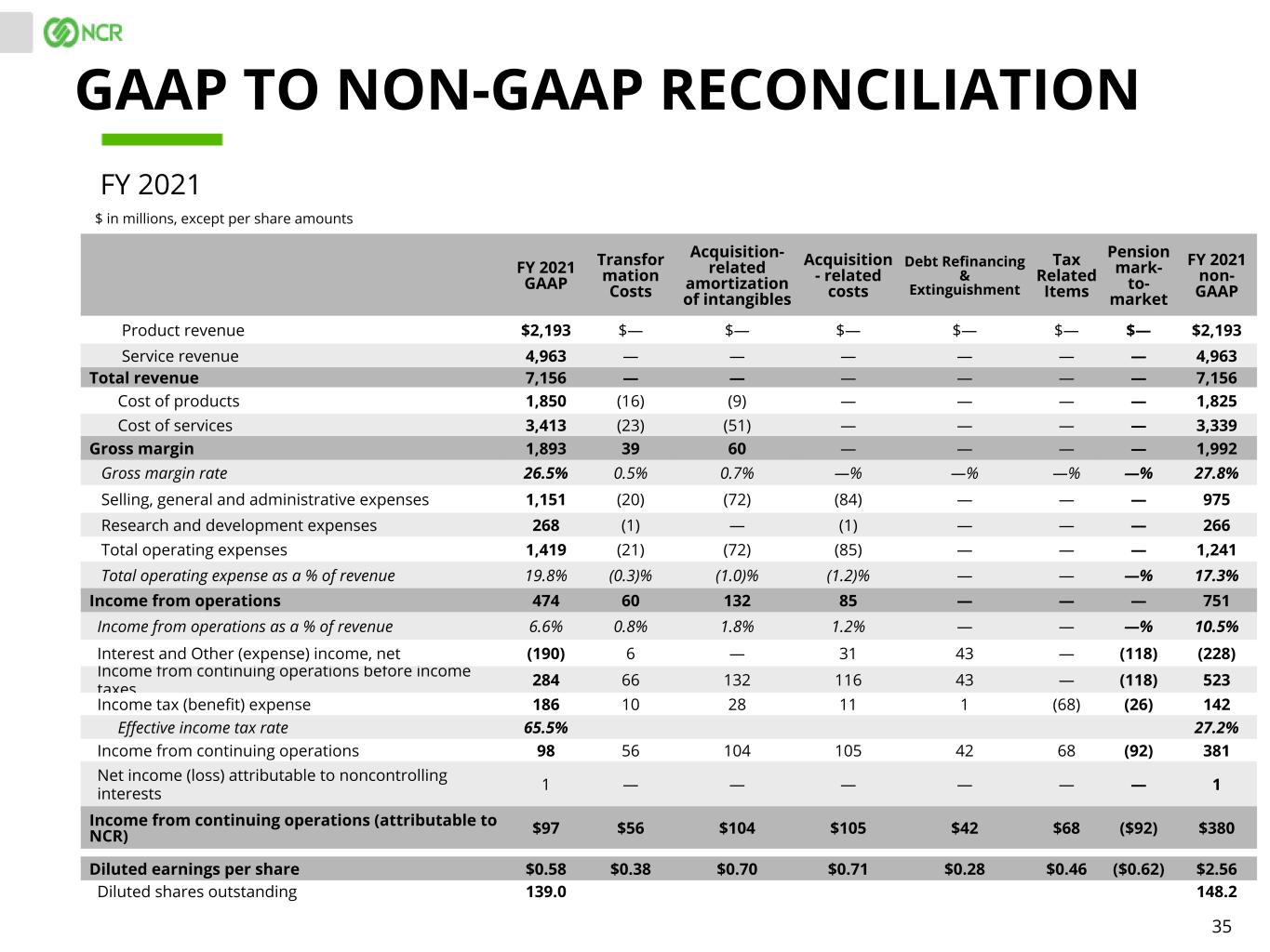 34 Q4 QTD 2021 GAAP Transfor mation Costs Acquisition- related amortization of intangibles Acquisition - related costs Debt Refinancing & Extinguish- ment Tax Related Items Pension mark-to- market adjustments Q4 QTD 2021 non- GAAP Product revenue $640 $— $— $— $— $— $— $640 Service revenue 1,394 — — — — — — 1,394 Total revenue 2,034 — — — — — — 2,034 Cost of products 560 (16) (1) — — — — 543 Cost of services 971 (9) (20) — — — — 942 Gross margin 503 25 21 — — — — 549 Gross margin rate 24.7% 1.3% 1.0% —% —% —% —% 27.0% Selling, general and administrative expenses 316 (15) (23) (7) — — — 271 Research and development expenses 64 — — (1) — — — 63 Total operating expenses 380 (15) (23) (8) — — — 334 Total operating expense as a % of revenue 18.7% (0.3)% (1.0)% (1.2)% — — — 16.4% Income from operations 123 40 44 8 — — — 215 Income from operations as a % of revenue 6.0% 0.8% 1.8% 1.2% — — — 10.6% Interest and Other (expense) income, net 49 6 — — — — (118) (63) Income from continuing operations before income taxes 172 46 44 8 — — (118) 152 Income tax (benefit) expense 109 7 9 (12) — (48) (26) 39 Effective income tax rate 63.4% 25.7% Income from continuing operations 63 39 35 20 — 48 (92) 113 Net income (loss) attributable to noncontrolling interests (1) — — — — — — (1) Income from continuing operations (attributable to NCR) $64 $39 $35 $20 $— $48 ($92) $114 Diluted earnings per share $0.43 $0.26 $0.23 $0.13 $— $0.32 ($0.62) $0.76 Diluted shares outstanding 140.3 149.5 GAAP TO NON-GAAP RECONCILIATION $ in millions, except per share amounts Q4 2021