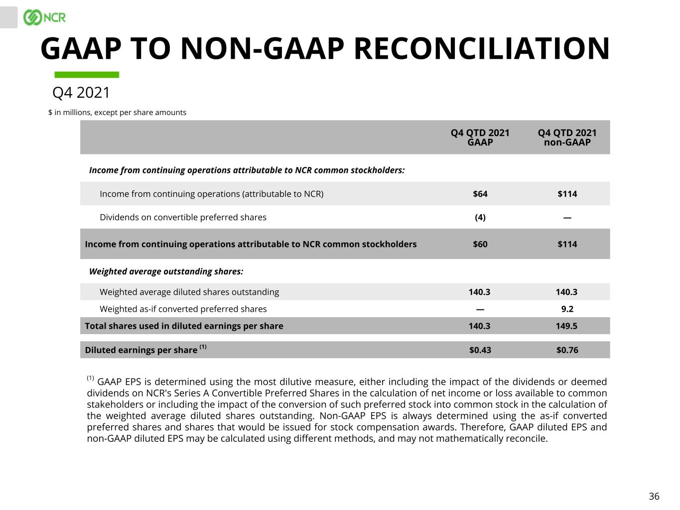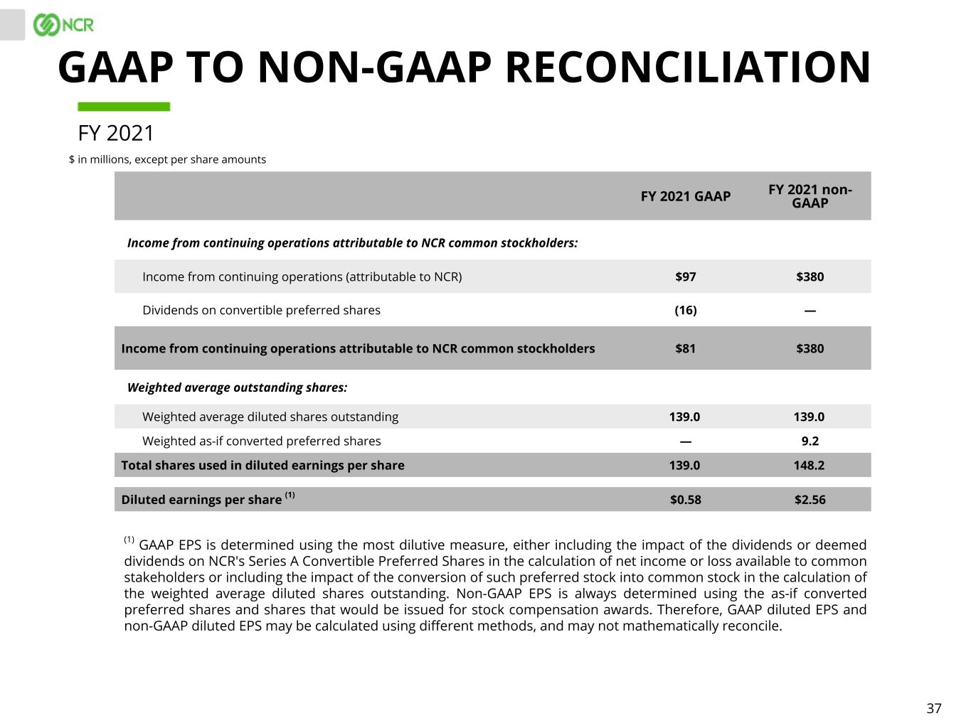 36 Q4 QTD 2021 GAAP Q4 QTD 2021 non-GAAP Income from continuing operations attributable to NCR common stockholders: Income from continuing operations (attributable to NCR) $64 $114 Dividends on convertible preferred shares (4) — Income from continuing operations attributable to NCR common stockholders $60 $114 Weighted average outstanding shares: Weighted average diluted shares outstanding 140.3 140.3 Weighted as-if converted preferred shares — 9.2 Total shares used in diluted earnings per share 140.3 149.5 Diluted earnings per share (1) $0.43 $0.76 (1) GAAP EPS is determined using the most dilutive measure, either including the impact of the dividends or deemed dividends on NCR's Series A Convertible Preferred Shares in the calculation of net income or loss available to common stakeholders or including the impact of the conversion of such preferred stock into common stock in the calculation of the weighted average diluted shares outstanding. Non-GAAP EPS is always determined using the as-if converted preferred shares and shares that would be issued for stock compensation awards. Therefore, GAAP diluted EPS and non-GAAP diluted EPS may be calculated using different methods, and may not mathematically reconcile. GAAP TO NON-GAAP RECONCILIATION $ in millions, except per share amounts Q4 2021