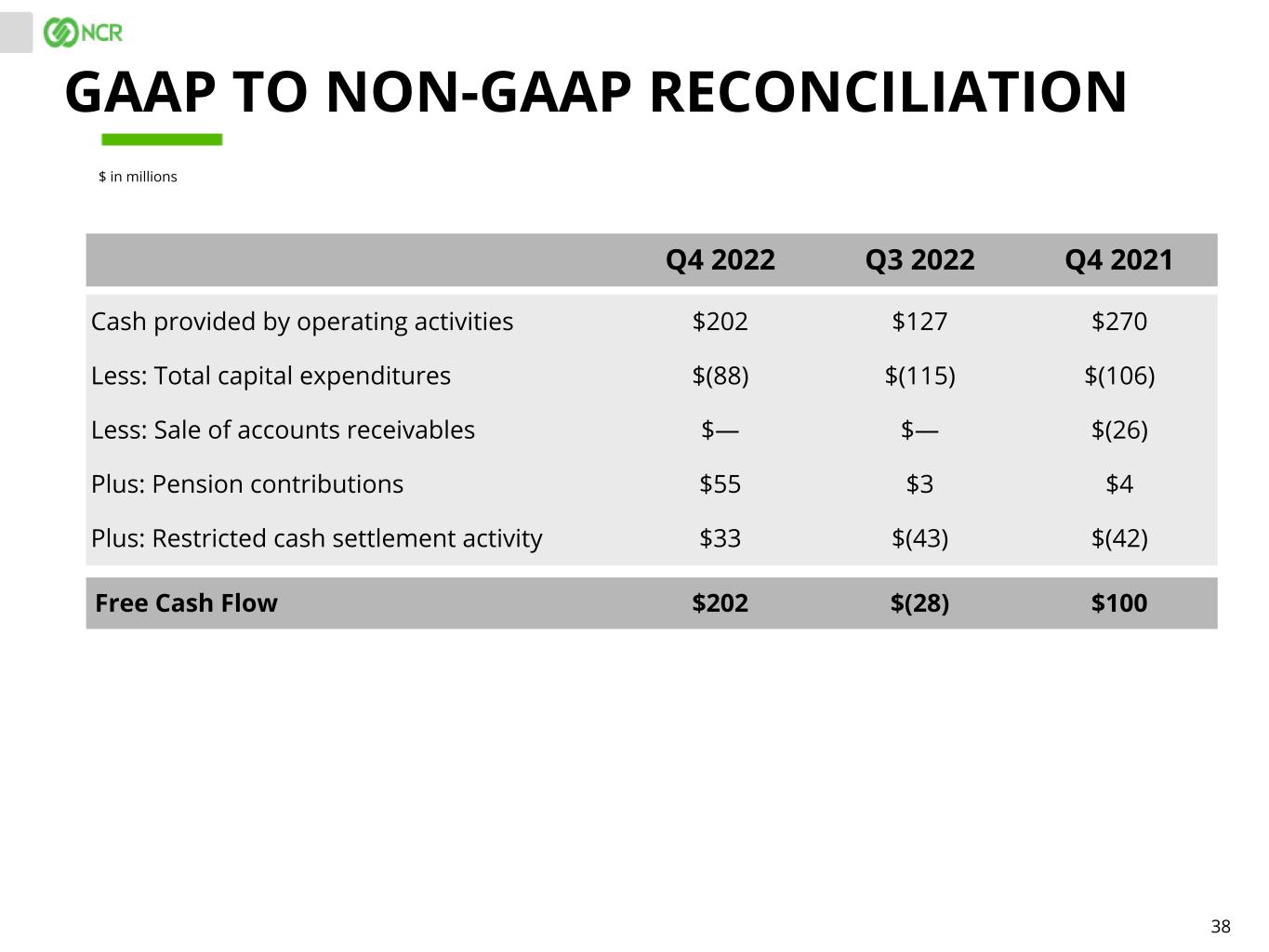 37 FY 2021 GAAP FY 2021 non- GAAP Income from continuing operations attributable to NCR common stockholders: Income from continuing operations (attributable to NCR) $97 $380 Dividends on convertible preferred shares (16) — Income from continuing operations attributable to NCR common stockholders $81 $380 Weighted average outstanding shares: Weighted average diluted shares outstanding 139.0 139.0 Weighted as-if converted preferred shares — 9.2 Total shares used in diluted earnings per share 139.0 148.2 Diluted earnings per share (1) $0.58 $2.56 (1) GAAP EPS is determined using the most dilutive measure, either including the impact of the dividends or deemed dividends on NCR's Series A Convertible Preferred Shares in the calculation of net income or loss available to common stakeholders or including the impact of the conversion of such preferred stock into common stock in the calculation of the weighted average diluted shares outstanding. Non-GAAP EPS is always determined using the as-if converted preferred shares and shares that would be issued for stock compensation awards. Therefore, GAAP diluted EPS and non-GAAP diluted EPS may be calculated using different methods, and may not mathematically reconcile. GAAP TO NON-GAAP RECONCILIATION $ in millions, except per share amounts FY 2021