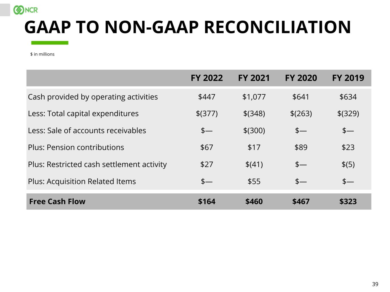 38 Q4 2022 Q3 2022 Q4 2021 Cash provided by operating activities $202 $127 $270 Less: Total capital expenditures $(88) $(115) $(106) Less: Sale of accounts receivables $— $— $(26) Plus: Pension contributions $55 $3 $4 Plus: Restricted cash settlement activity $33 $(43) $(42) Free Cash Flow $202 $(28) $100 $ in millions GAAP TO NON-GAAP RECONCILIATION