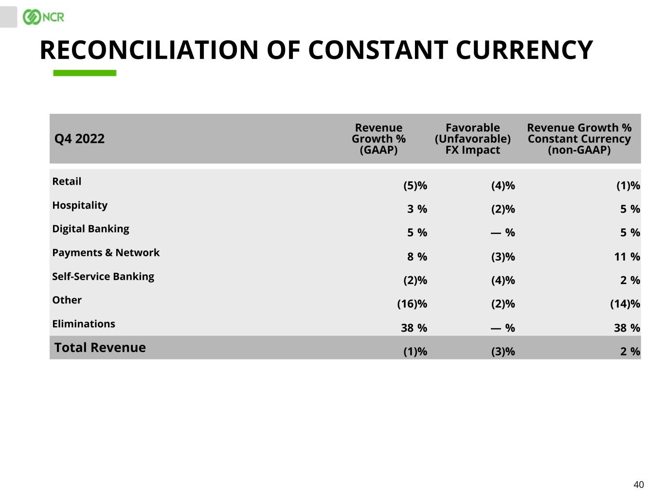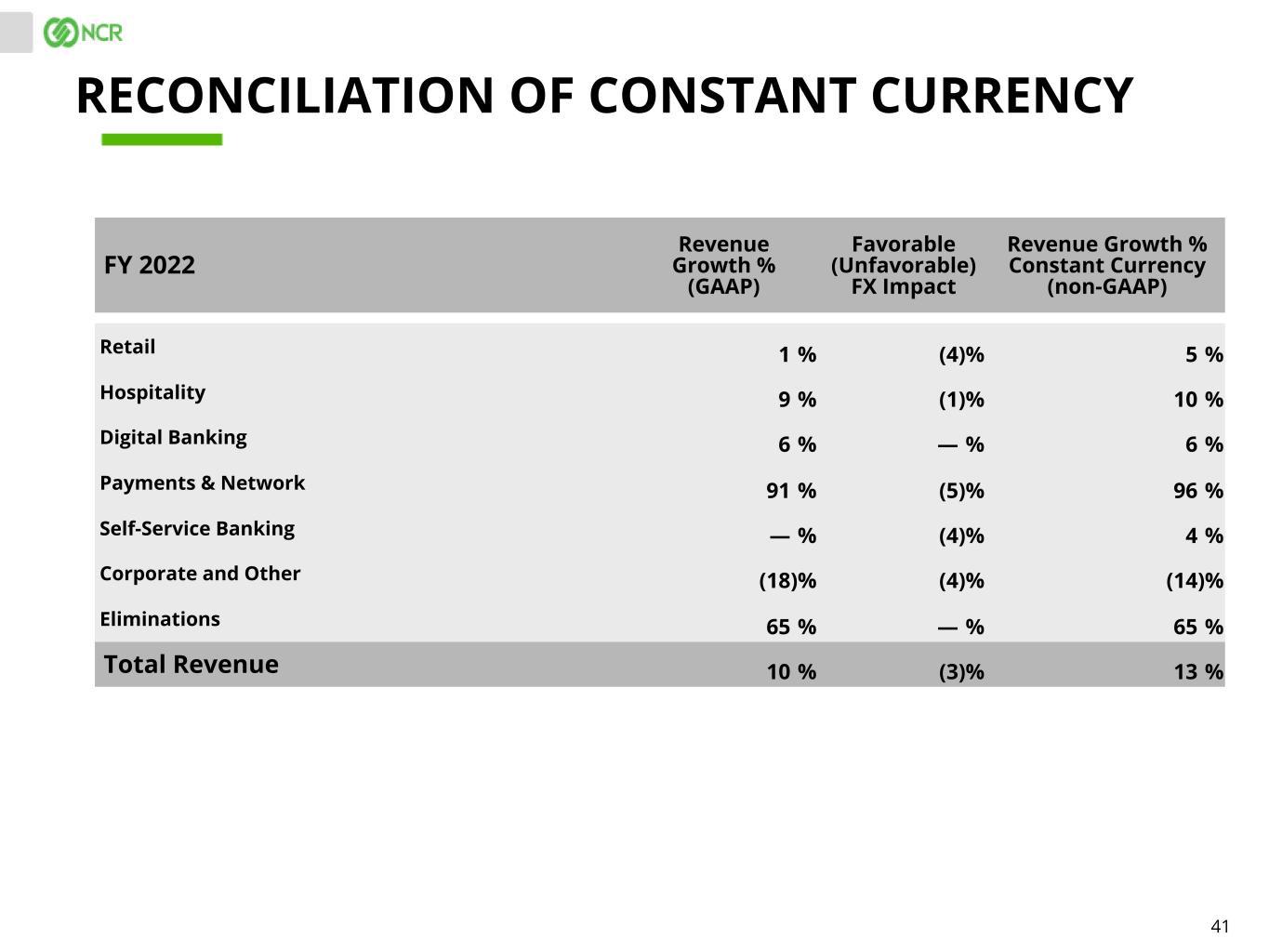 40 Q4 2022 Revenue Growth % (GAAP) Favorable (Unfavorable) FX Impact Revenue Growth % Constant Currency (non-GAAP) Retail (5) % (4) % (1) % Hospitality 3 % (2) % 5 % Digital Banking 5 % — % 5 % Payments & Network 8 % (3) % 11 % Self-Service Banking (2) % (4) % 2 % Other (16) % (2) % (14) % Eliminations 38 % — % 38 % Total Revenue (1) % (3) % 2 % RECONCILIATION OF CONSTANT CURRENCY