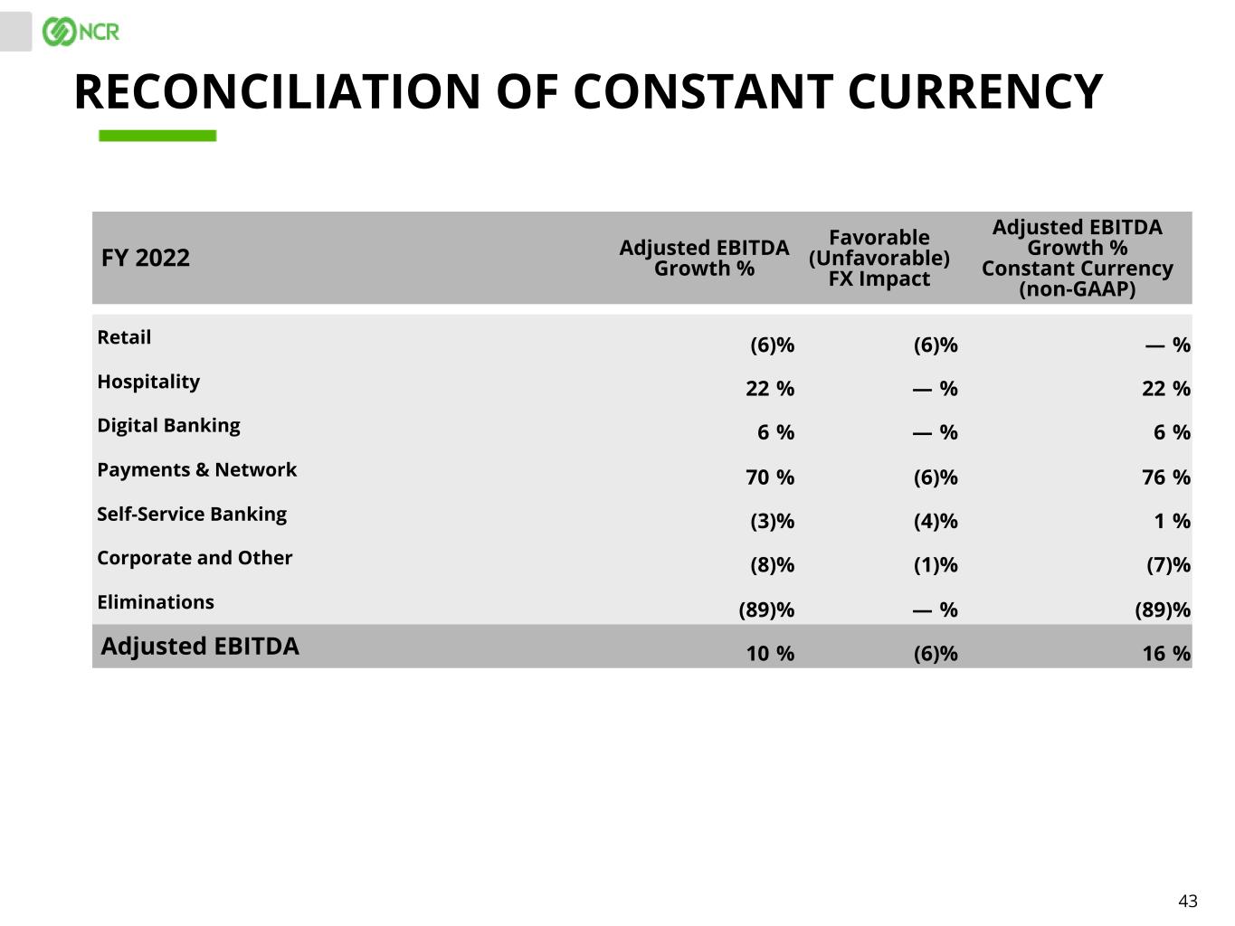 42 Q4 2022 Adjusted EBITDA Growth % Favorable (Unfavorable) FX Impact Adjusted EBITDA Growth % Constant Currency (non-GAAP) Retail (3) % (5) % 2 % Hospitality 38 % — % 38 % Digital Banking 4 % — % 4 % Payments & Network (9) % (4) % (5) % Self-Service Banking 9 % (4) % 13 % Corporate and Other 12 % (4) % 16 % Eliminations (50) % — % (50) % Adjusted EBITDA 8 % (6) % 14 % RECONCILIATION OF CONSTANT CURRENCY