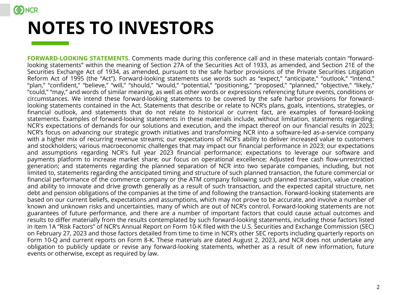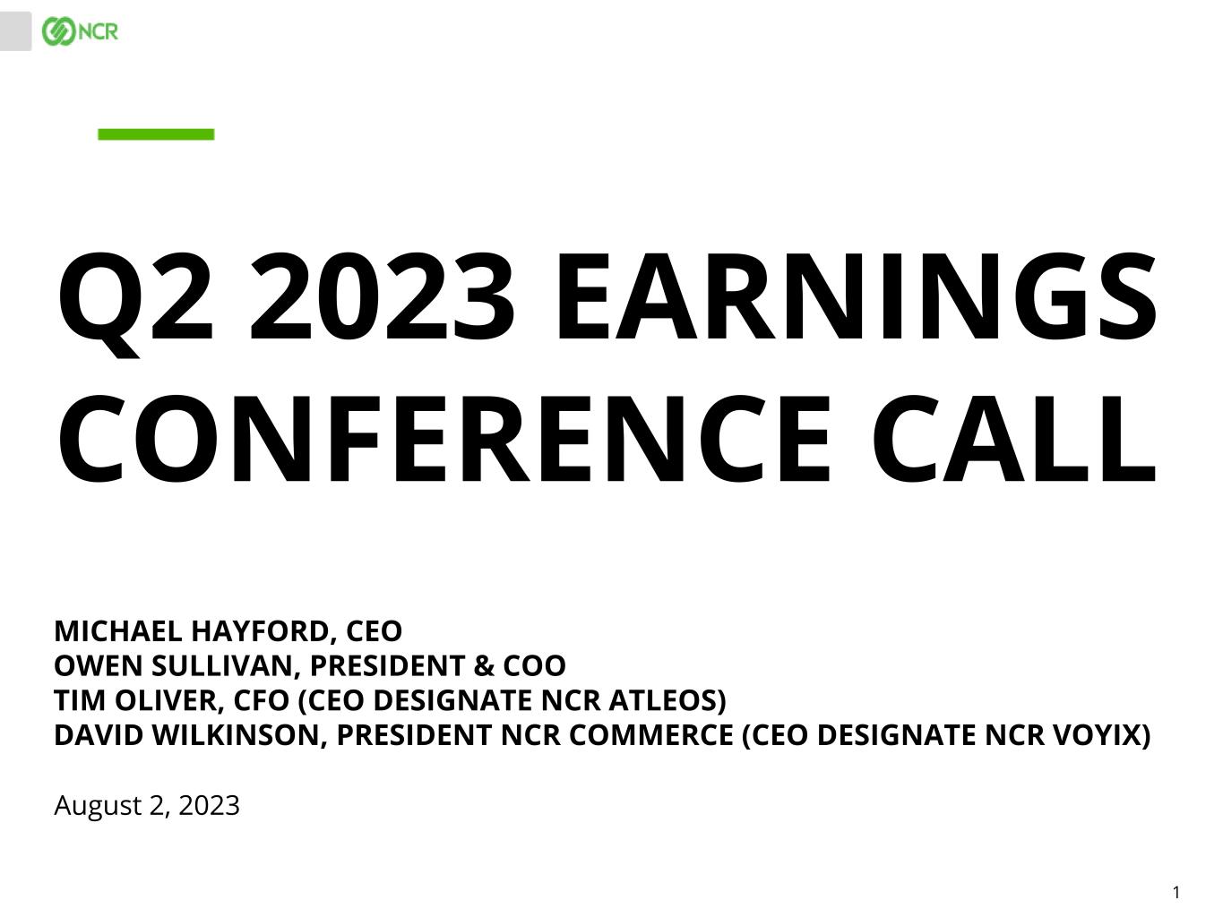 1 Q2 2023 EARNINGS CONFERENCE CALL MICHAEL HAYFORD, CEO OWEN SULLIVAN, PRESIDENT & COO TIM OLIVER, CFO (CEO DESIGNATE NCR ATLEOS) DAVID WILKINSON, PRESIDENT NCR COMMERCE (CEO DESIGNATE NCR VOYIX) August 2, 2023