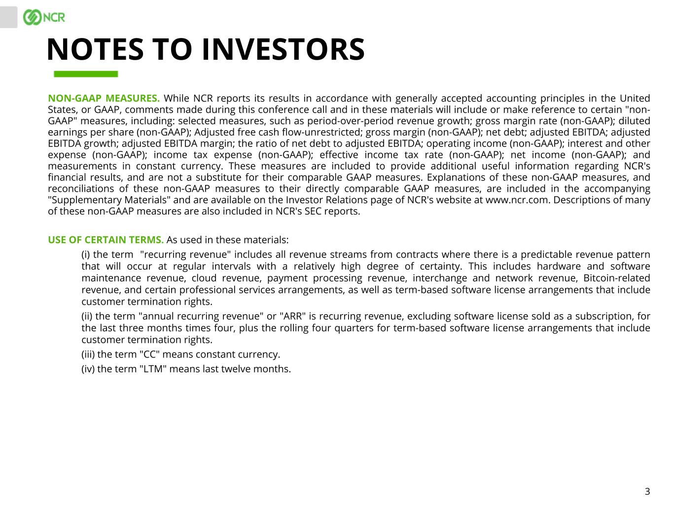 3 NON-GAAP MEASURES. While NCR reports its results in accordance with generally accepted accounting principles in the United States, or GAAP, comments made during this conference call and in these materials will include or make reference to certain "non- GAAP" measures, including: selected measures, such as period-over-period revenue growth; gross margin rate (non-GAAP); diluted earnings per share (non-GAAP); Adjusted free cash flow-unrestricted; gross margin (non-GAAP); net debt; adjusted EBITDA; adjusted EBITDA growth; adjusted EBITDA margin; the ratio of net debt to adjusted EBITDA; operating income (non-GAAP); interest and other expense (non-GAAP); income tax expense (non-GAAP); effective income tax rate (non-GAAP); net income (non-GAAP); and measurements in constant currency. These measures are included to provide additional useful information regarding NCR's financial results, and are not a substitute for their comparable GAAP measures. Explanations of these non-GAAP measures, and reconciliations of these non-GAAP measures to their directly comparable GAAP measures, are included in the accompanying "Supplementary Materials" and are available on the Investor Relations page of NCR's website at www.ncr.com. Descriptions of many of these non-GAAP measures are also included in NCR's SEC reports. USE OF CERTAIN TERMS. As used in these materials: (i) the term "recurring revenue" includes all revenue streams from contracts where there is a predictable revenue pattern that will occur at regular intervals with a relatively high degree of certainty. This includes hardware and software maintenance revenue, cloud revenue, payment processing revenue, interchange and network revenue, Bitcoin-related revenue, and certain professional services arrangements, as well as term-based software license arrangements that include customer termination rights. (ii) the term "annual recurring revenue" or "ARR" is recurring revenue, excluding software license sold as a subscription, for the last three months times four, plus the rolling four quarters for term-based software license arrangements that include customer termination rights. (iii) the term "CC" means constant currency. (iv) the term "LTM" means last twelve months. NOTES TO INVESTORS
