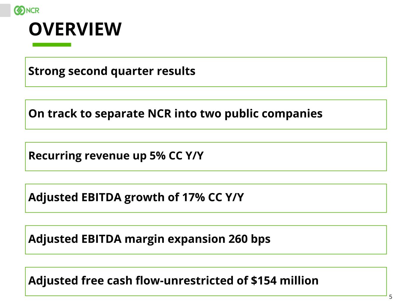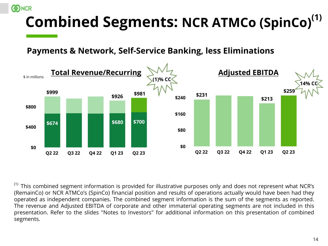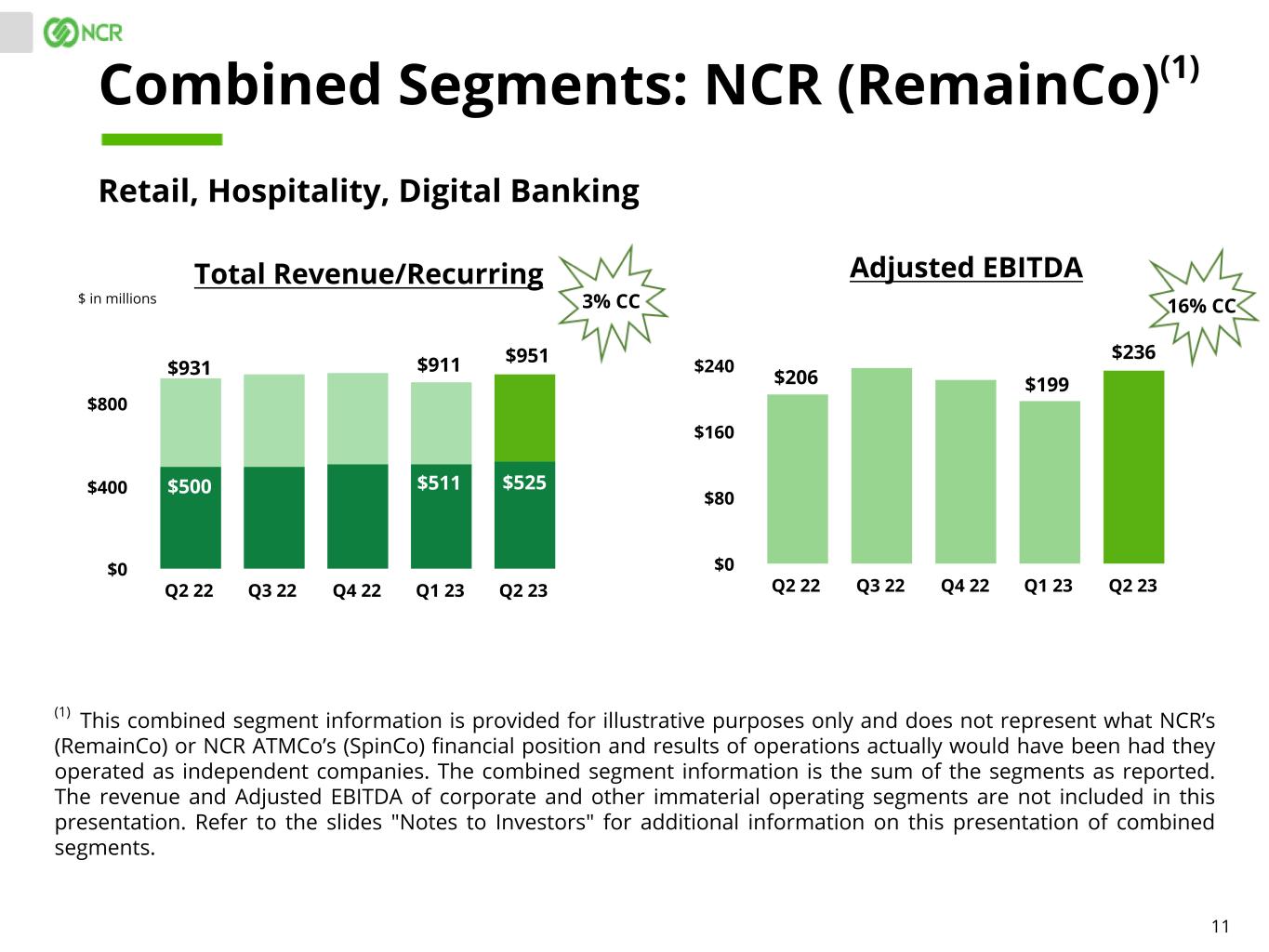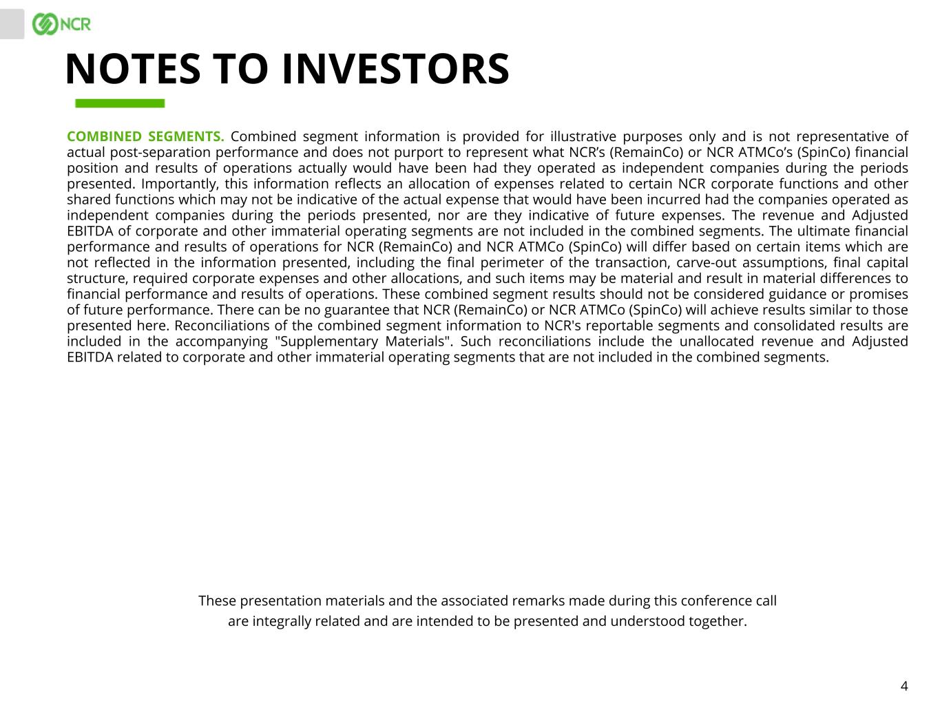 4 COMBINED SEGMENTS. Combined segment information is provided for illustrative purposes only and is not representative of actual post-separation performance and does not purport to represent what NCR’s (RemainCo) or NCR ATMCo’s (SpinCo) financial position and results of operations actually would have been had they operated as independent companies during the periods presented. Importantly, this information reflects an allocation of expenses related to certain NCR corporate functions and other shared functions which may not be indicative of the actual expense that would have been incurred had the companies operated as independent companies during the periods presented, nor are they indicative of future expenses. The revenue and Adjusted EBITDA of corporate and other immaterial operating segments are not included in the combined segments. The ultimate financial performance and results of operations for NCR (RemainCo) and NCR ATMCo (SpinCo) will differ based on certain items which are not reflected in the information presented, including the final perimeter of the transaction, carve-out assumptions, final capital structure, required corporate expenses and other allocations, and such items may be material and result in material differences to financial performance and results of operations. These combined segment results should not be considered guidance or promises of future performance. There can be no guarantee that NCR (RemainCo) or NCR ATMCo (SpinCo) will achieve results similar to those presented here. Reconciliations of the combined segment information to NCR's reportable segments and consolidated results are included in the accompanying "Supplementary Materials". Such reconciliations include the unallocated revenue and Adjusted EBITDA related to corporate and other immaterial operating segments that are not included in the combined segments. These presentation materials and the associated remarks made during this conference call are integrally related and are intended to be presented and understood together. NOTES TO INVESTORS