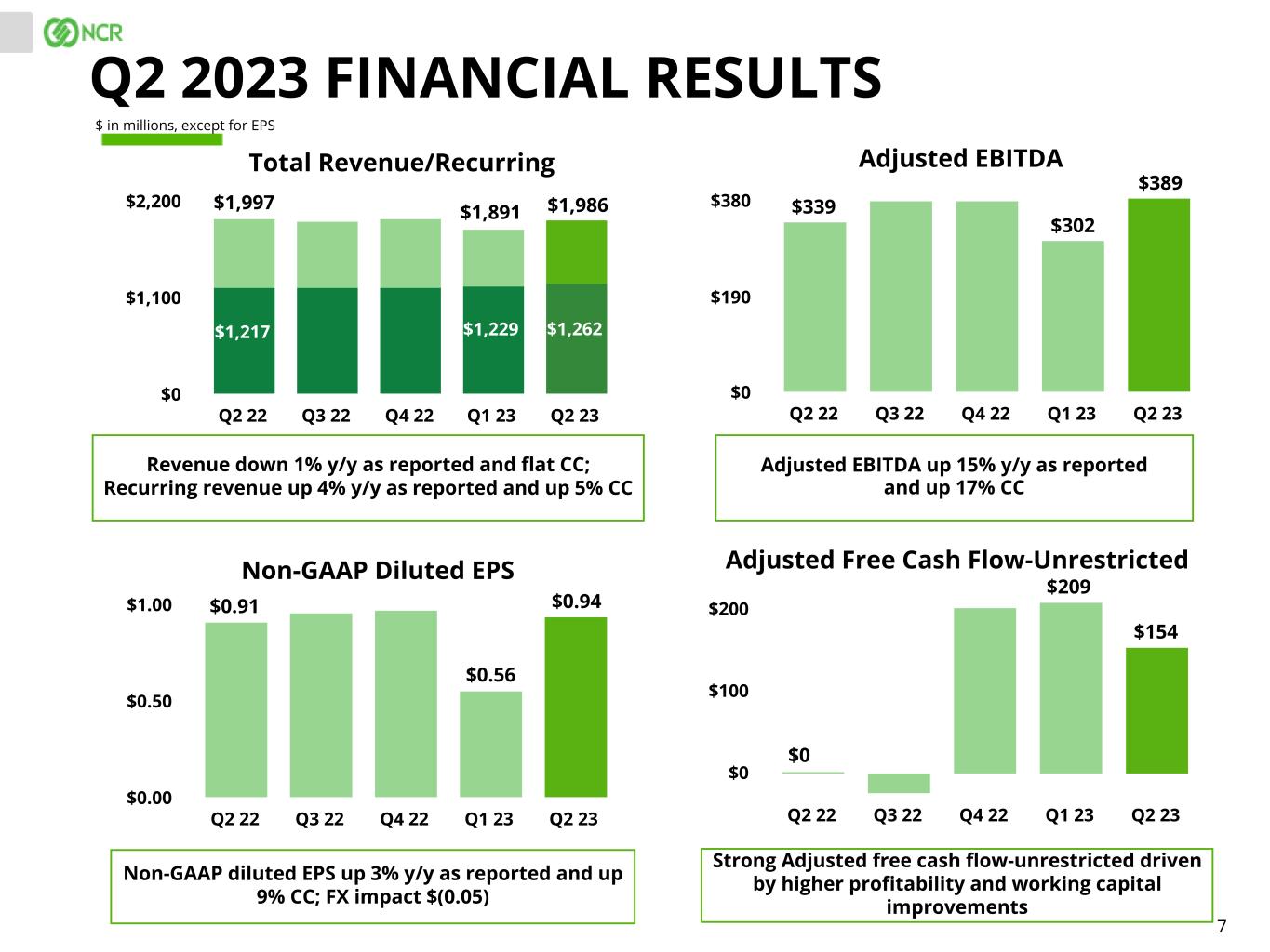 6 STRATEGIC BUSINESS UPDATE Strong execution advancing strategic growth initiatives Retail - Momentum in NCR EmeraldTM Hospitality - Continue growth in AlohaTM Digital Banking – Winning in the market Payments - Strong growth across Merchant acquiring and AllpointTM networks Self-Service Banking - Acceleration in ATMaaS