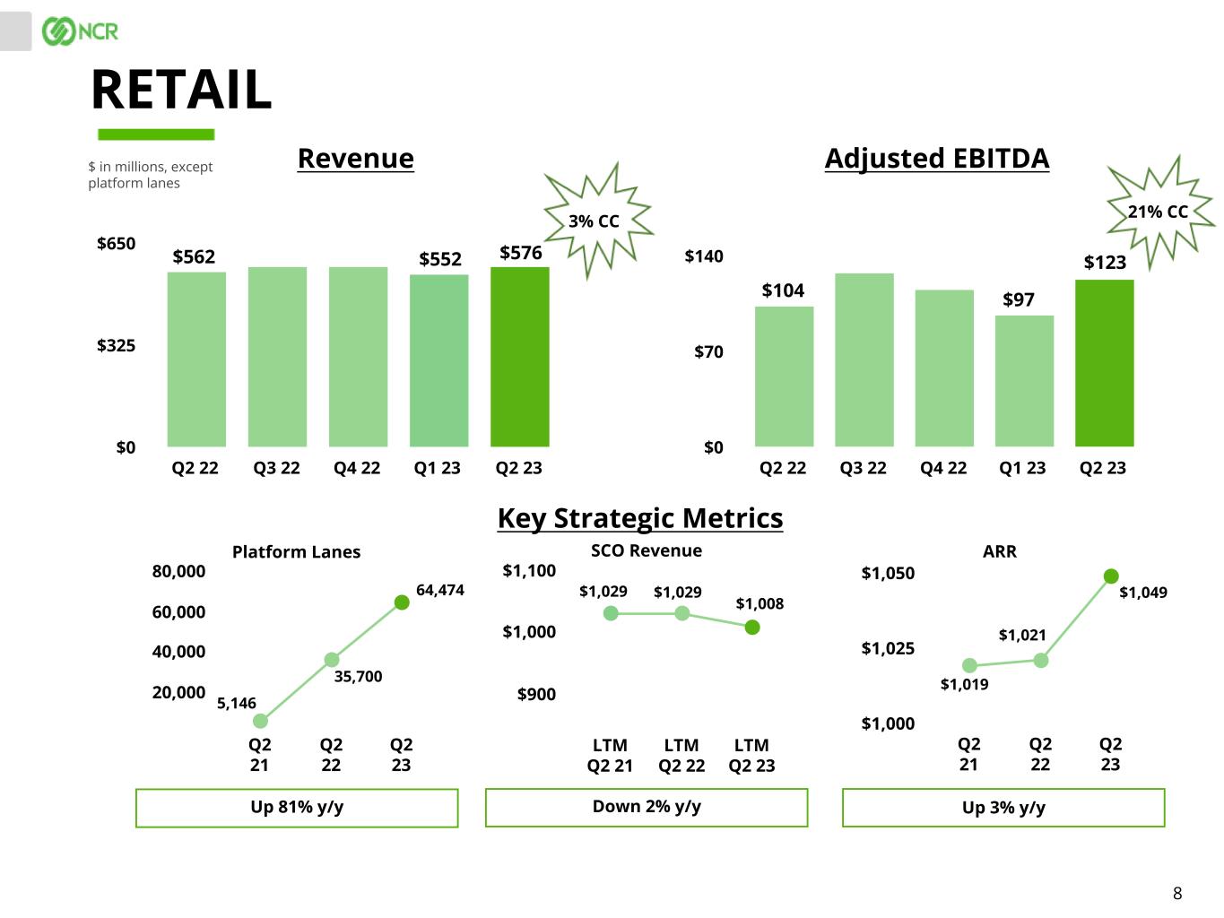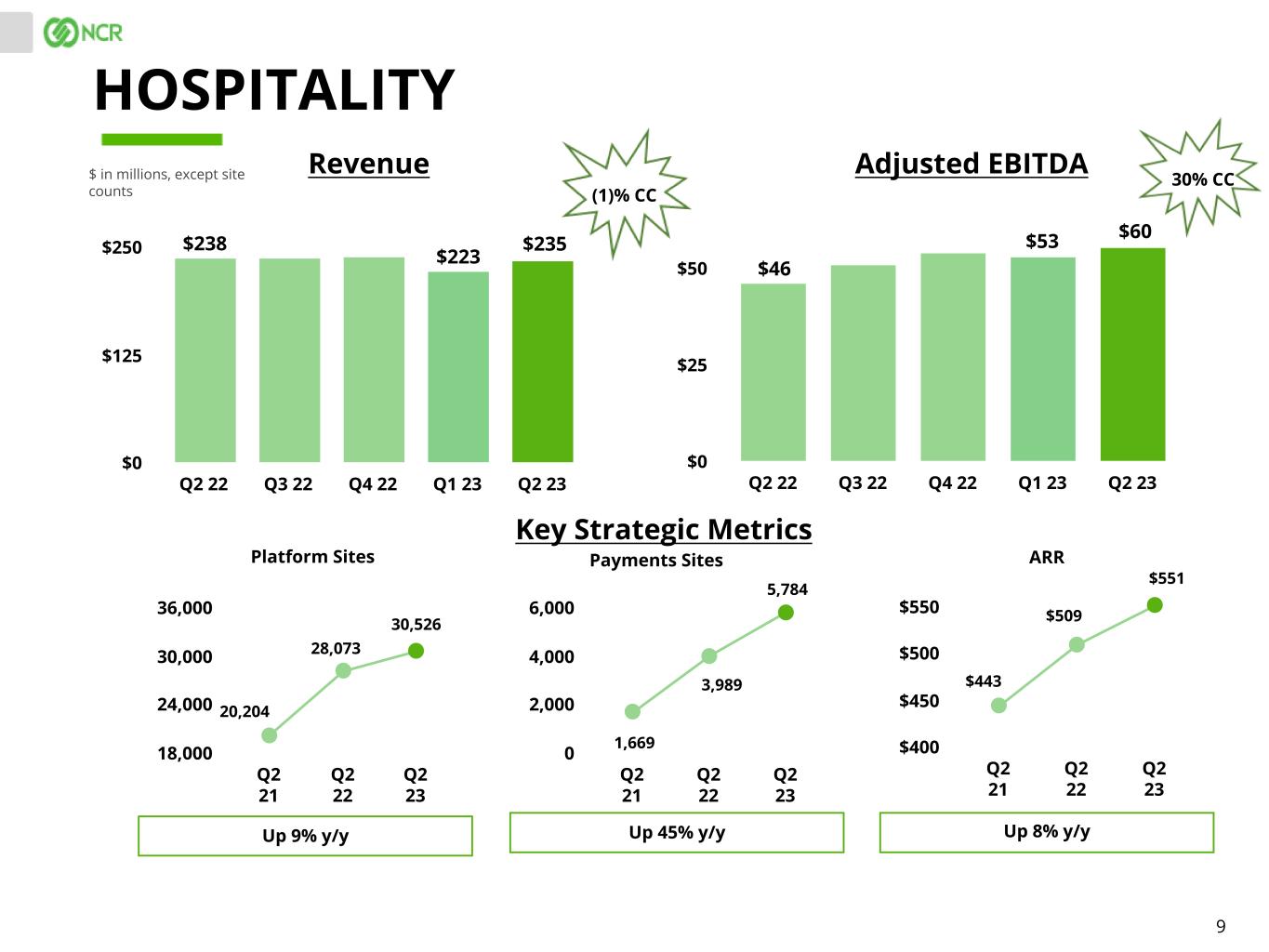 8 $ in millions, except platform lanes RETAIL Revenue Adjusted EBITDA Q2 22 Q3 22 Q4 22 Q1 23 Q2 23 $0 $325 $650 Q2 22 Q3 22 Q4 22 Q1 23 Q2 23 $0 $70 $140 SCO RevenuePlatform Lanes Q2 21 Q2 22 Q2 23 20,000 40,000 60,000 80,000 ARR Down 2% y/y Q2 21 Q2 22 Q2 23 $1,000 $1,025 $1,050 LTM Q2 21 LTM Q2 22 LTM Q2 23 $900 $1,000 $1,100 Key Strategic Metrics Up 3% y/yUp 81% y/y $562 $552 $104 $97 35,700 64,474 $1,021 $1,008 $1,029 $576 $123 $1,049$1,029 5,146 $1,019 21% CC3% CC