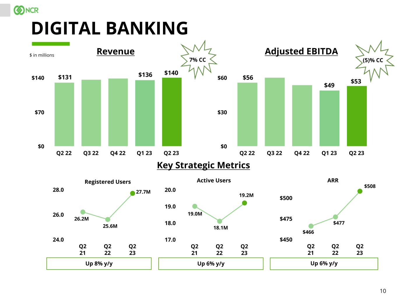 9 $ in millions, except site counts HOSPITALITY Revenue Adjusted EBITDA Q2 22 Q3 22 Q4 22 Q1 23 Q2 23 $0 $125 $250 Q2 22 Q3 22 Q4 22 Q1 23 Q2 23 $0 $25 $50 Platform Sites ARR Q2 21 Q2 22 Q2 23 18,000 24,000 30,000 36,000 Up 9% y/y Up 8% y/y Q2 21 Q2 22 Q2 23 $400 $450 $500 $550 Key Strategic Metrics $238 $223 $46 $53 28,073 $509 $235 $60 $551 30,526 $443 20,204 Payments Sites Q2 21 Q2 22 Q2 23 0 2,000 4,000 6,000 Up 45% y/y 3,989 5,784 1,669 30% CC (1)% CC