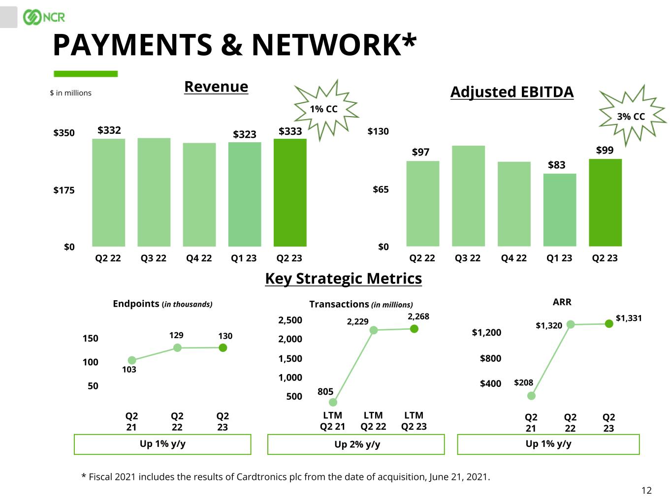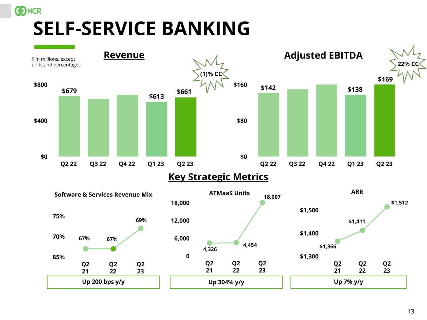 12 Q2 21 Q2 22 Q2 23 50 100 150 $ in millions PAYMENTS & NETWORK* Revenue Adjusted EBITDA Q2 22 Q3 22 Q4 22 Q1 23 Q2 23 $0 $175 $350 Q2 22 Q3 22 Q4 22 Q1 23 Q2 23 $0 $65 $130$332 LTM Q2 21 LTM Q2 22 LTM Q2 23 500 1,000 1,500 2,000 2,500 Endpoints (in thousands) Transactions (in millions) ARR Up 1% y/y Up 2% y/y Q2 21 Q2 22 Q2 23 $400 $800 $1,200 Up 1% y/y Key Strategic Metrics $323 103 $83 $97 2,229 $1,320 129 $333 $99 2,268 130 805 $208 1% CC 3% CC * Fiscal 2021 includes the results of Cardtronics plc from the date of acquisition, June 21, 2021. $1,331