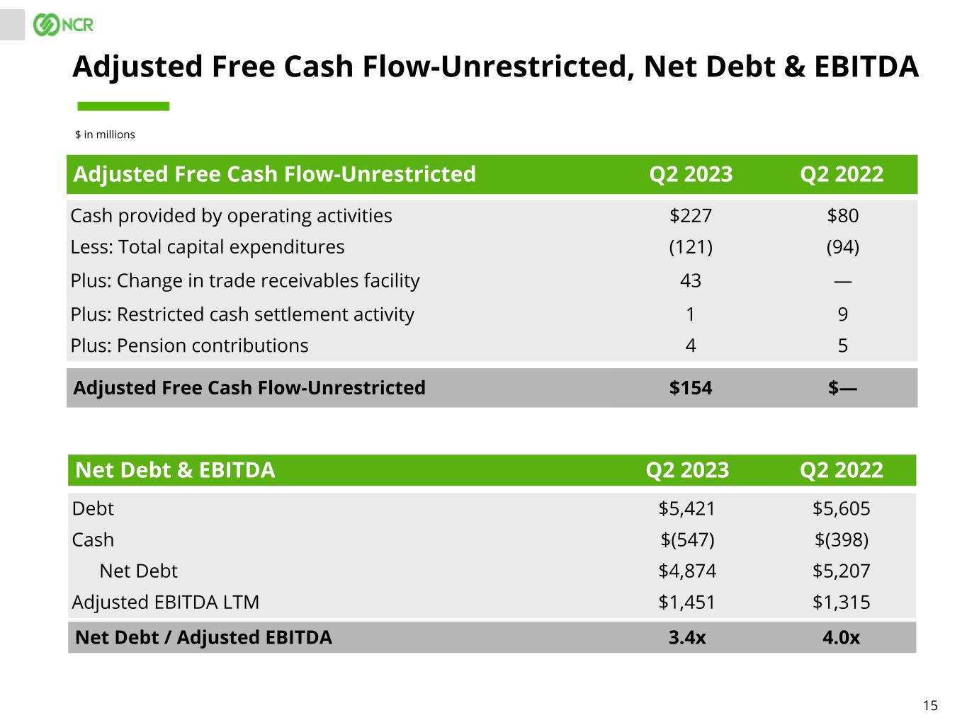 14 $ in millions Combined Segments: NCR ATMCo (SpinCo)(1) Total Revenue/Recurring Adjusted EBITDA Payments & Network, Self-Service Banking, less Eliminations Q2 22 Q3 22 Q4 22 Q1 23 Q2 23 $0 $400 $800 Q2 22 Q3 22 Q4 22 Q1 23 Q2 23 $0 $80 $160 $240 $999 $926 $981 $231 $213 $259 (1)% CC 14% CC (1) This combined segment information is provided for illustrative purposes only and does not represent what NCR’s (RemainCo) or NCR ATMCo’s (SpinCo) financial position and results of operations actually would have been had they operated as independent companies. The combined segment information is the sum of the segments as reported. The revenue and Adjusted EBITDA of corporate and other immaterial operating segments are not included in this presentation. Refer to the slides "Notes to Investors" for additional information on this presentation of combined segments. $700$680$674