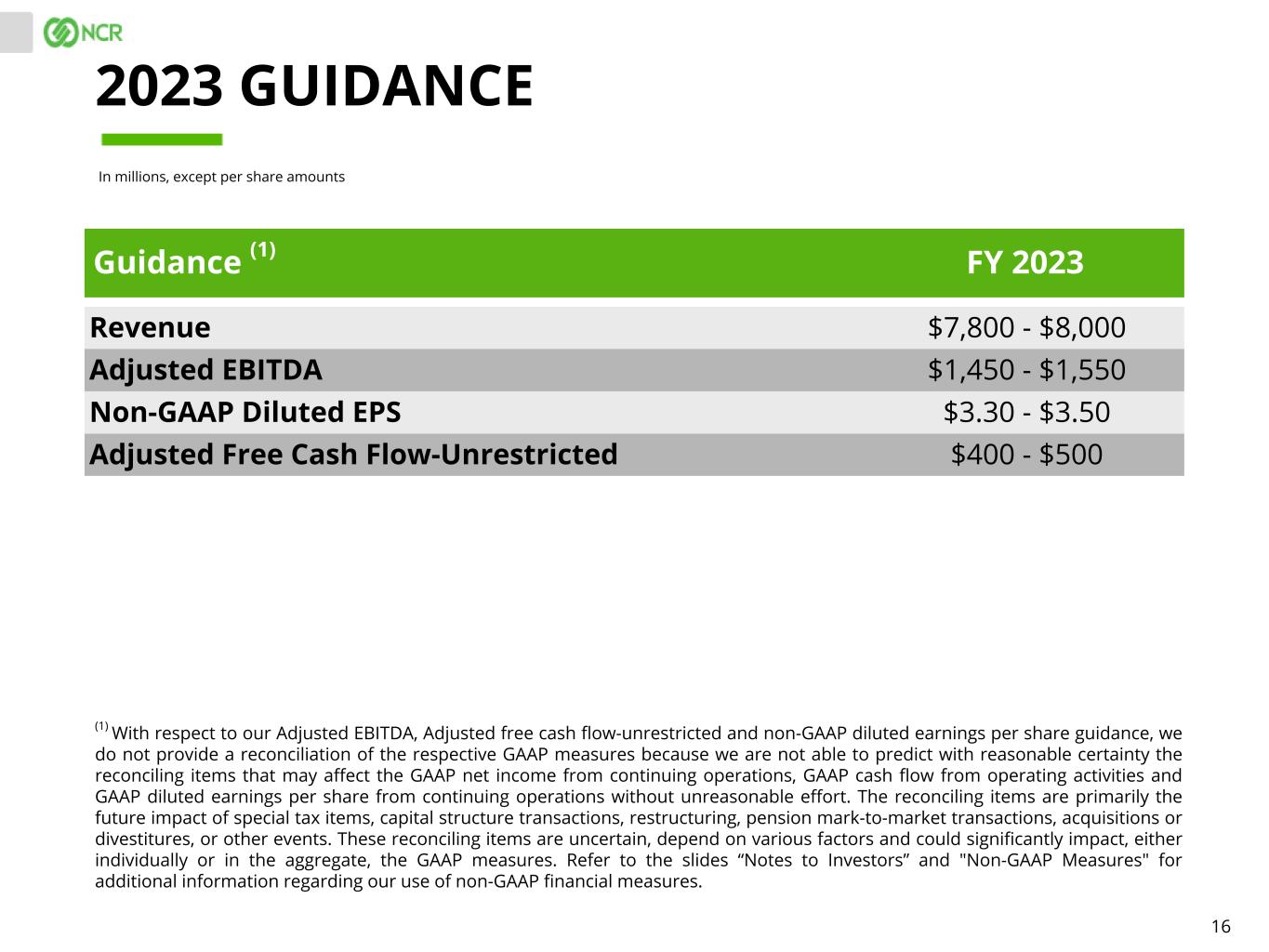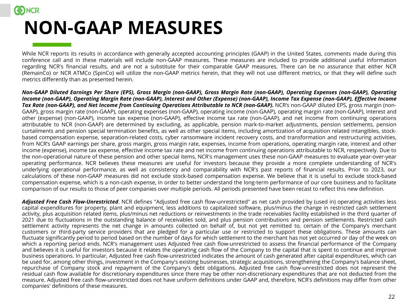 22 While NCR reports its results in accordance with generally accepted accounting principles (GAAP) in the United States, comments made during this conference call and in these materials will include non-GAAP measures. These measures are included to provide additional useful information regarding NCR's financial results, and are not a substitute for their comparable GAAP measures. There can be no assurance that either NCR (RemainCo) or NCR ATMCo (SpinCo) will utilize the non-GAAP metrics herein, that they will not use different metrics, or that they will define such metrics differently than as presented herein. Non-GAAP Diluted Earnings Per Share (EPS), Gross Margin (non-GAAP), Gross Margin Rate (non-GAAP), Operating Expenses (non-GAAP), Operating Income (non-GAAP), Operating Margin Rate (non-GAAP), Interest and Other (Expense) (non-GAAP), Income Tax Expense (non-GAAP), Effective Income Tax Rate (non-GAAP), and Net Income from Continuing Operations Attributable to NCR (non-GAAP). NCR’s non-GAAP diluted EPS, gross margin (non- GAAP), gross margin rate (non-GAAP), operating expenses (non-GAAP), operating income (non-GAAP), operating margin rate (non-GAAP), interest and other (expense) (non-GAAP), income tax expense (non-GAAP), effective income tax rate (non-GAAP), and net income from continuing operations attributable to NCR (non-GAAP) are determined by excluding, as applicable, pension mark-to-market adjustments, pension settlements, pension curtailments and pension special termination benefits, as well as other special items, including amortization of acquisition related intangibles, stock- based compensation expense, separation-related costs, cyber ransomware incident recovery costs, and transformation and restructuring activities, from NCR’s GAAP earnings per share, gross margin, gross margin rate, expenses, income from operations, operating margin rate, interest and other income (expense), income tax expense, effective income tax rate and net income from continuing operations attributable to NCR, respectively. Due to the non-operational nature of these pension and other special items, NCR's management uses these non-GAAP measures to evaluate year-over-year operating performance. NCR believes these measures are useful for investors because they provide a more complete understanding of NCR's underlying operational performance, as well as consistency and comparability with NCR's past reports of financial results. Prior to 2023, our calculations of these non-GAAP measures did not exclude stock-based compensation expense. We believe that it is useful to exclude stock-based compensation expense, which is a non-cash expense, in order to better understand the long-term performance of our core business and to facilitate comparison of our results to those of peer companies over multiple periods. All periods presented have been recast to reflect this new definition. Adjusted Free Cash Flow-Unrestricted. NCR defines "Adjusted free cash flow-unrestricted" as net cash provided by (used in) operating activities less capital expenditures for property, plant and equipment, less additions to capitalized software, plus/minus the change in restricted cash settlement activity, plus acquisition related items, plus/minus net reductions or reinvestments in the trade receivables facility established in the third quarter of 2021 due to fluctuations in the outstanding balance of receivables sold, and plus pension contributions and pension settlements. Restricted cash settlement activity represents the net change in amounts collected on behalf of, but not yet remitted to, certain of the Company’s merchant customers or third-party service providers that are pledged for a particular use or restricted to support these obligations. These amounts can fluctuate significantly period to period based on the number of days for which settlement to the merchant has not yet occurred or day of the week on which a reporting period ends. NCR's management uses Adjusted free cash flow-unrestricted to assess the financial performance of the Company and believes it is useful for investors because it relates the operating cash flow of the Company to the capital that is spent to continue and improve business operations. In particular, Adjusted free cash flow-unrestricted indicates the amount of cash generated after capital expenditures, which can be used for, among other things, investment in the Company's existing businesses, strategic acquisitions, strengthening the Company's balance sheet, repurchase of Company stock and repayment of the Company's debt obligations. Adjusted free cash flow-unrestricted does not represent the residual cash flow available for discretionary expenditures since there may be other non-discretionary expenditures that are not deducted from the measure. Adjusted free cash flow-unrestricted does not have uniform definitions under GAAP and, therefore, NCR's definitions may differ from other companies' definitions of these measures. NON-GAAP MEASURES