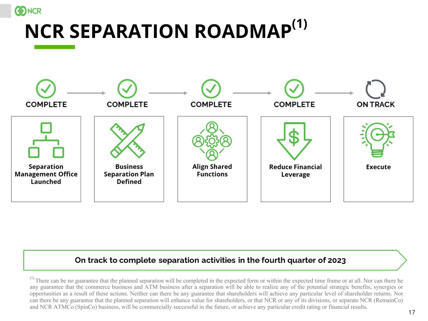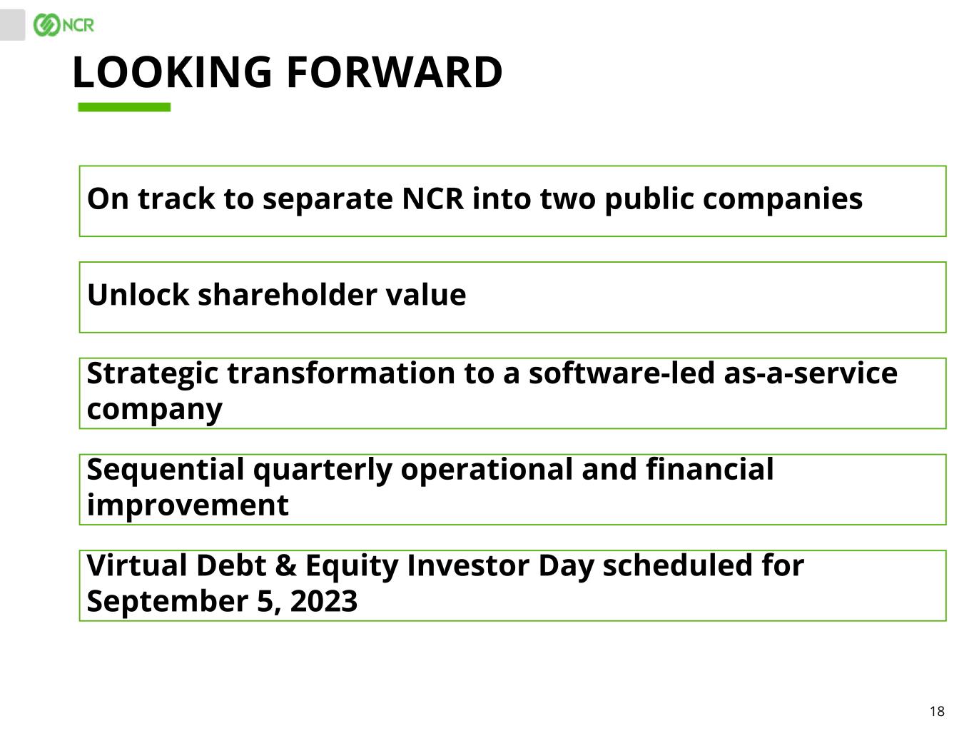 17 NCR SEPARATION ROADMAP(1) (1) There can be no guarantee that the planned separation will be completed in the expected form or within the expected time frame or at all. Nor can there be any guarantee that the commerce business and ATM business after a separation will be able to realize any of the potential strategic benefits, synergies or opportunities as a result of these actions. Neither can there be any guarantee that shareholders will achieve any particular level of shareholder returns. Nor can there be any guarantee that the planned separation will enhance value for shareholders, or that NCR or any of its divisions, or separate NCR (RemainCo) and NCR ATMCo (SpinCo) business, will be commercially successful in the future, or achieve any particular credit rating or financial results.