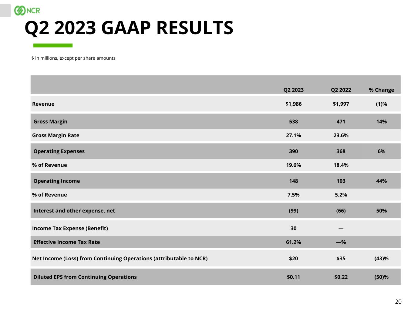 20 Q2 2023 Q2 2022 % Change Revenue $1,986 $1,997 (1)% Gross Margin 538 471 14% Gross Margin Rate 27.1% 23.6% Operating Expenses 390 368 6% % of Revenue 19.6% 18.4% Operating Income 148 103 44% % of Revenue 7.5% 5.2% Interest and other expense, net (99) (66) 50% Income Tax Expense (Benefit) 30 — Effective Income Tax Rate 61.2% —% Net Income (Loss) from Continuing Operations (attributable to NCR) $20 $35 (43)% Diluted EPS from Continuing Operations $0.11 $0.22 (50)% $ in millions, except per share amounts Q2 2023 GAAP RESULTS