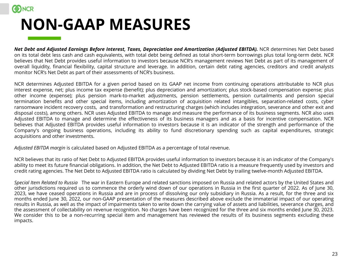 23 Net Debt and Adjusted Earnings Before Interest, Taxes, Depreciation and Amortization (Adjusted EBITDA). NCR determines Net Debt based on its total debt less cash and cash equivalents, with total debt being defined as total short-term borrowings plus total long-term debt. NCR believes that Net Debt provides useful information to investors because NCR’s management reviews Net Debt as part of its management of overall liquidity, financial flexibility, capital structure and leverage. In addition, certain debt rating agencies, creditors and credit analysts monitor NCR’s Net Debt as part of their assessments of NCR’s business. NCR determines Adjusted EBITDA for a given period based on its GAAP net income from continuing operations attributable to NCR plus interest expense, net; plus income tax expense (benefit); plus depreciation and amortization; plus stock-based compensation expense; plus other income (expense); plus pension mark-to-market adjustments, pension settlements, pension curtailments and pension special termination benefits and other special items, including amortization of acquisition related intangibles, separation-related costs, cyber ransomware incident recovery costs, and transformation and restructuring charges (which includes integration, severance and other exit and disposal costs), among others. NCR uses Adjusted EBITDA to manage and measure the performance of its business segments. NCR also uses Adjusted EBITDA to manage and determine the effectiveness of its business managers and as a basis for incentive compensation. NCR believes that Adjusted EBITDA provides useful information to investors because it is an indicator of the strength and performance of the Company's ongoing business operations, including its ability to fund discretionary spending such as capital expenditures, strategic acquisitions and other investments. Adjusted EBITDA margin is calculated based on Adjusted EBITDA as a percentage of total revenue. NCR believes that its ratio of Net Debt to Adjusted EBITDA provides useful information to investors because it is an indicator of the Company's ability to meet its future financial obligations. In addition, the Net Debt to Adjusted EBITDA ratio is a measure frequently used by investors and credit rating agencies. The Net Debt to Adjusted EBITDA ratio is calculated by dividing Net Debt by trailing twelve-month Adjusted EBITDA. Special Item Related to Russia The war in Eastern Europe and related sanctions imposed on Russia and related actors by the United States and other jurisdictions required us to commence the orderly wind down of our operations in Russia in the first quarter of 2022. As of June 30, 2023, we have ceased operations in Russia and are in process of dissolving our only subsidiary in Russia. As a result, for the three and six months ended June 30, 2022, our non-GAAP presentation of the measures described above exclude the immaterial impact of our operating results in Russia, as well as the impact of impairments taken to write down the carrying value of assets and liabilities, severance charges, and the assessment of collectability on revenue recognition. No charges have been recognized for the three and six months ended June 30, 2023. We consider this to be a non-recurring special item and management has reviewed the results of its business segments excluding these impacts. NON-GAAP MEASURES