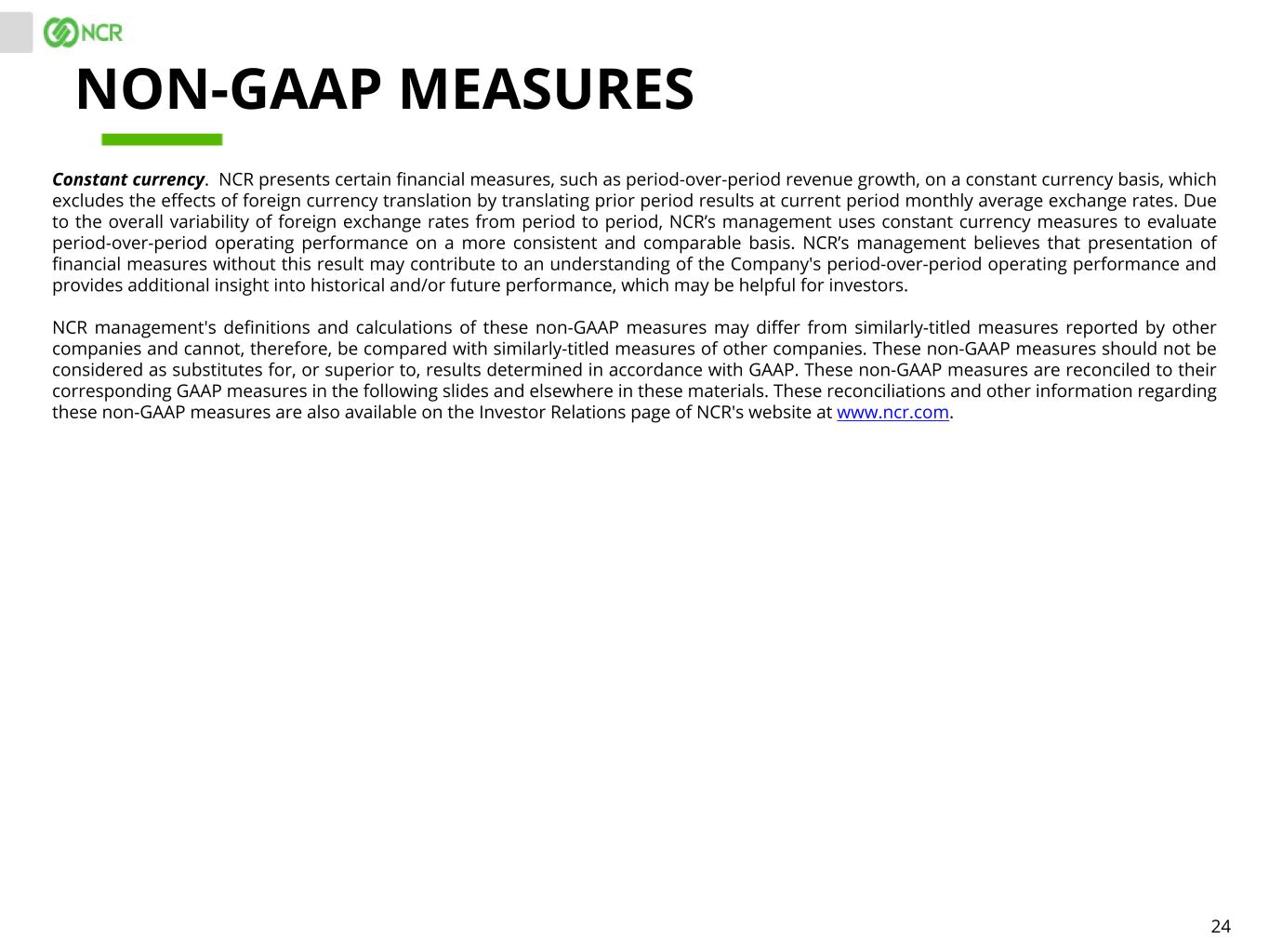 24 Constant currency. NCR presents certain financial measures, such as period-over-period revenue growth, on a constant currency basis, which excludes the effects of foreign currency translation by translating prior period results at current period monthly average exchange rates. Due to the overall variability of foreign exchange rates from period to period, NCR’s management uses constant currency measures to evaluate period-over-period operating performance on a more consistent and comparable basis. NCR’s management believes that presentation of financial measures without this result may contribute to an understanding of the Company's period-over-period operating performance and provides additional insight into historical and/or future performance, which may be helpful for investors. NCR management's definitions and calculations of these non-GAAP measures may differ from similarly-titled measures reported by other companies and cannot, therefore, be compared with similarly-titled measures of other companies. These non-GAAP measures should not be considered as substitutes for, or superior to, results determined in accordance with GAAP. These non-GAAP measures are reconciled to their corresponding GAAP measures in the following slides and elsewhere in these materials. These reconciliations and other information regarding these non-GAAP measures are also available on the Investor Relations page of NCR's website at www.ncr.com. NON-GAAP MEASURES