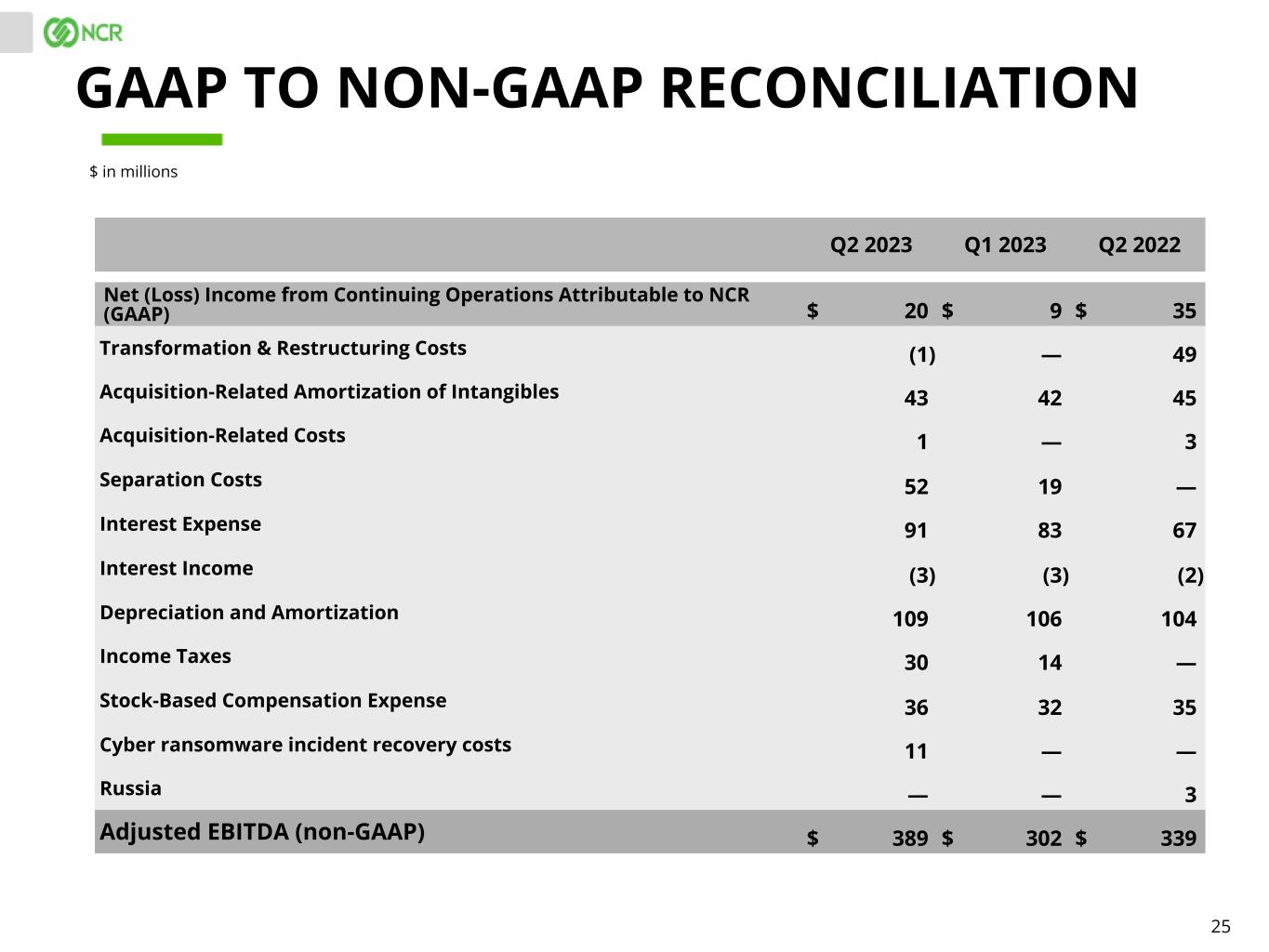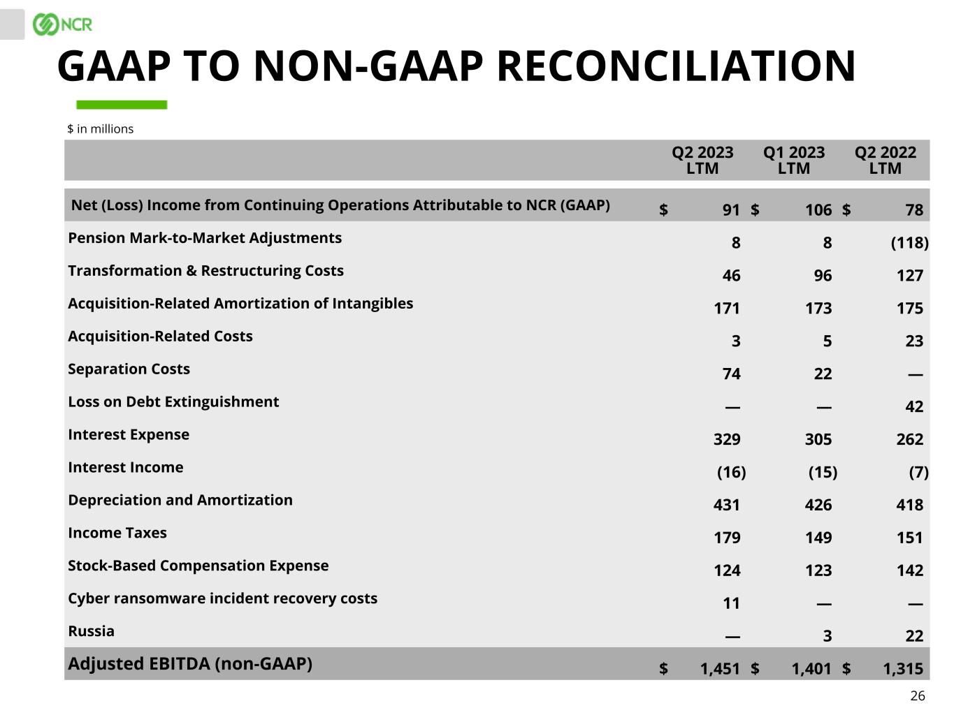 25 Q2 2023 Q1 2023 Q2 2022 Net (Loss) Income from Continuing Operations Attributable to NCR (GAAP) $ 20 $ 9 $ 35 Transformation & Restructuring Costs (1) — 49 Acquisition-Related Amortization of Intangibles 43 42 45 Acquisition-Related Costs 1 — 3 Separation Costs 52 19 — Interest Expense 91 83 67 Interest Income (3) (3) (2) Depreciation and Amortization 109 106 104 Income Taxes 30 14 — Stock-Based Compensation Expense 36 32 35 Cyber ransomware incident recovery costs 11 — — Russia — — 3 Adjusted EBITDA (non-GAAP) $ 389 $ 302 $ 339 GAAP TO NON-GAAP RECONCILIATION $ in millions