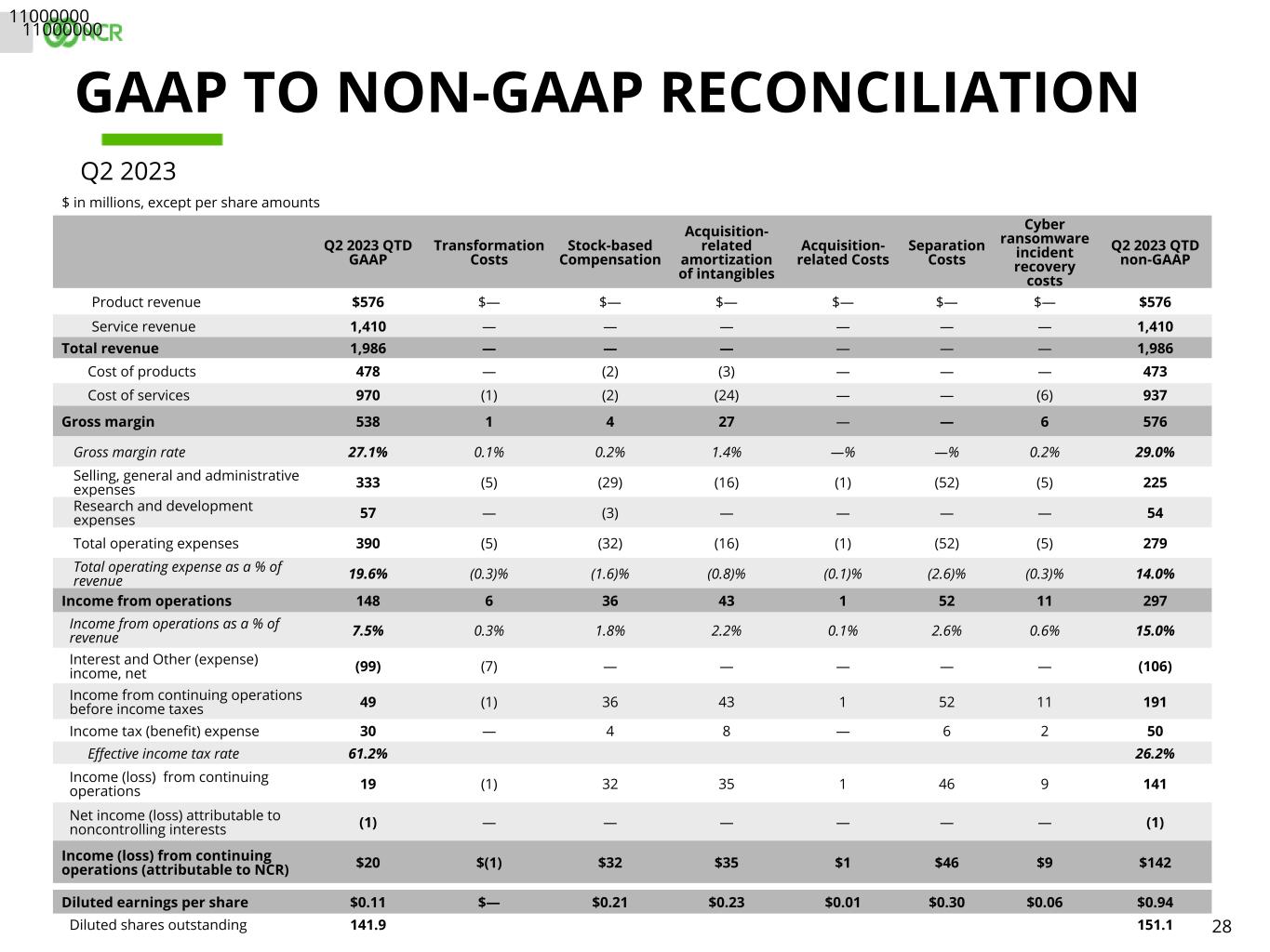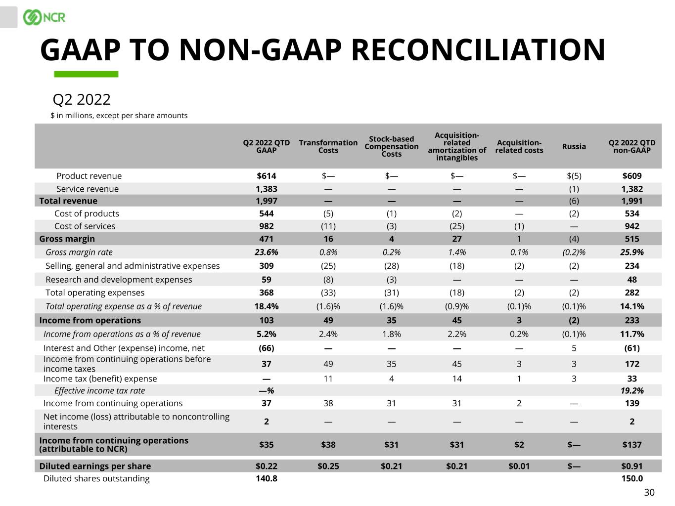 30 Q2 2022 QTD GAAP Transformation Costs Stock-based Compensation Costs Acquisition- related amortization of intangibles Acquisition- related costs Russia Q2 2022 QTD non-GAAP Product revenue $614 $— $— $— $— $(5) $609 Service revenue 1,383 — — — — (1) 1,382 Total revenue 1,997 — — — — (6) 1,991 Cost of products 544 (5) (1) (2) — (2) 534 Cost of services 982 (11) (3) (25) (1) — 942 Gross margin 471 16 4 27 1 (4) 515 Gross margin rate 23.6% 0.8% 0.2% 1.4% 0.1% (0.2)% 25.9% Selling, general and administrative expenses 309 (25) (28) (18) (2) (2) 234 Research and development expenses 59 (8) (3) — — — 48 Total operating expenses 368 (33) (31) (18) (2) (2) 282 Total operating expense as a % of revenue 18.4% (1.6)% (1.6)% (0.9)% (0.1)% (0.1)% 14.1% Income from operations 103 49 35 45 3 (2) 233 Income from operations as a % of revenue 5.2% 2.4% 1.8% 2.2% 0.2% (0.1)% 11.7% Interest and Other (expense) income, net (66) — — — — 5 (61) Income from continuing operations before income taxes 37 49 35 45 3 3 172 Income tax (benefit) expense — 11 4 14 1 3 33 Effective income tax rate —% 19.2% Income from continuing operations 37 38 31 31 2 — 139 Net income (loss) attributable to noncontrolling interests 2 — — — — — 2 Income from continuing operations (attributable to NCR) $35 $38 $31 $31 $2 $— $137 35000000 38000000 31000000 31000000 2000000 0Diluted earnings per share $0.22 $0.25 $0.21 $0.21 $0.01 $— $0.91 Diluted shares outstanding 140.8 150.0 GAAP TO NON-GAAP RECONCILIATION $ in millions, except per share amounts Q2 2022