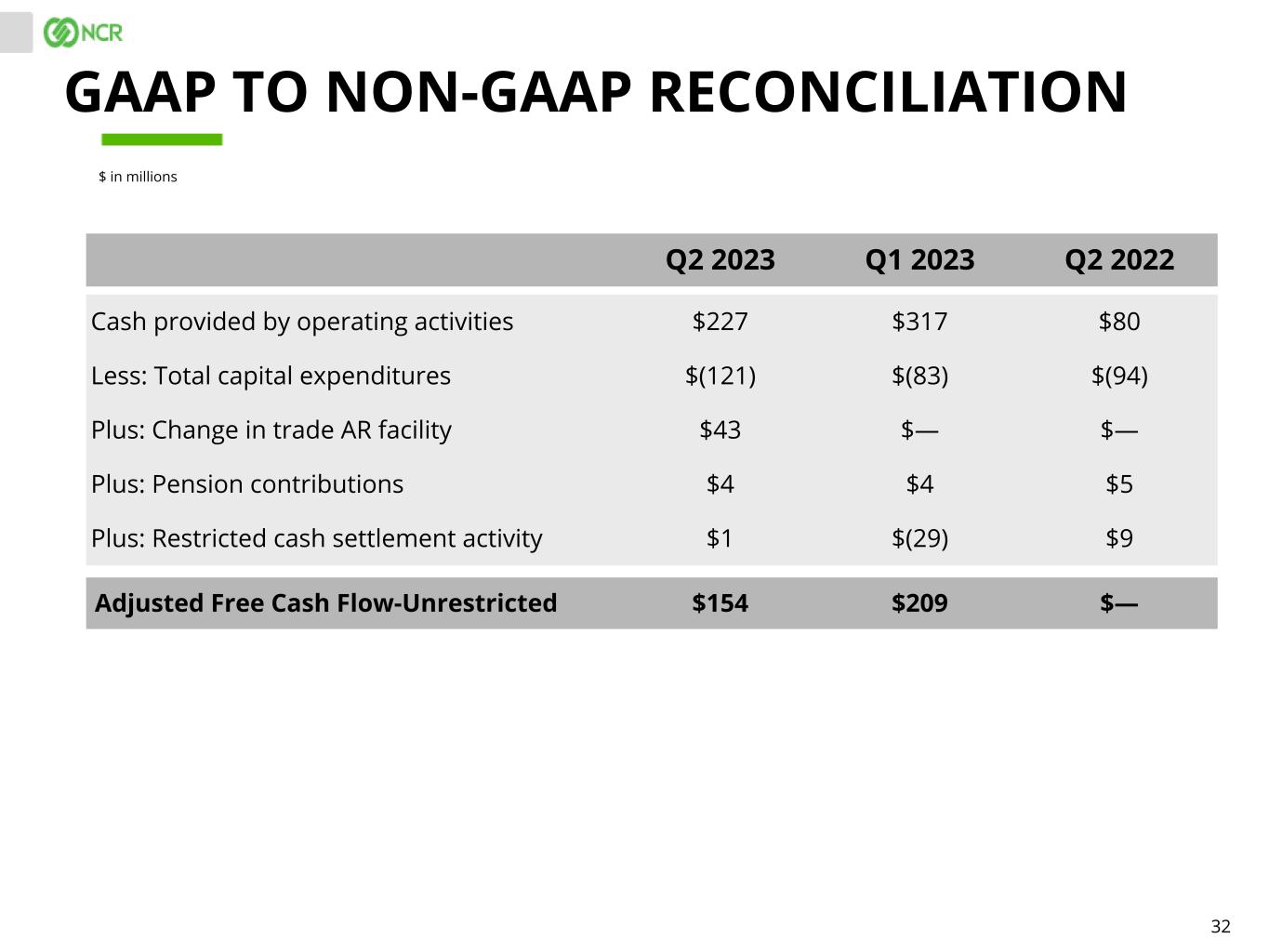 31 Q2 2022 QTD GAAP Q2 2022 QTD non- GAAP Income from continuing operations attributable to NCR common stockholders: Income from continuing operations (attributable to NCR) $35 $137 Dividends on convertible preferred shares $(4) $— Income from continuing operations attributable to NCR common stockholders $31 $137 Weighted average outstanding shares: Weighted average diluted shares outstanding 140.8 140.8 Weighted as-if converted preferred shares — 9.2 Total shares used in diluted earnings per share 140.8 150.0 Diluted earnings per share (1) $0.22 $0.91 (1) GAAP EPS is determined using the most dilutive measure, either including the impact of the dividends or deemed dividends on NCR's Series A Convertible Preferred Shares in the calculation of net income or loss available to common stakeholders or including the impact of the conversion of such preferred stock into common stock in the calculation of the weighted average diluted shares outstanding. Non-GAAP EPS is always determined using the as-if converted preferred shares and shares that would be issued for stock compensation awards. Therefore, GAAP diluted EPS and non-GAAP diluted EPS may be calculated using different methods, and may not mathematically reconcile. GAAP TO NON-GAAP RECONCILIATION $ in millions, except per share amounts Q2 2022