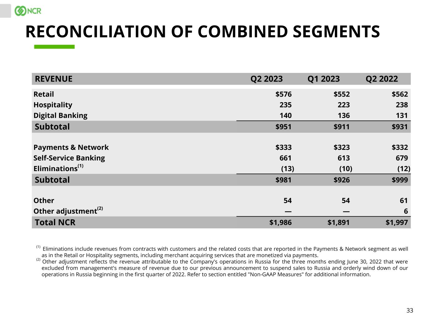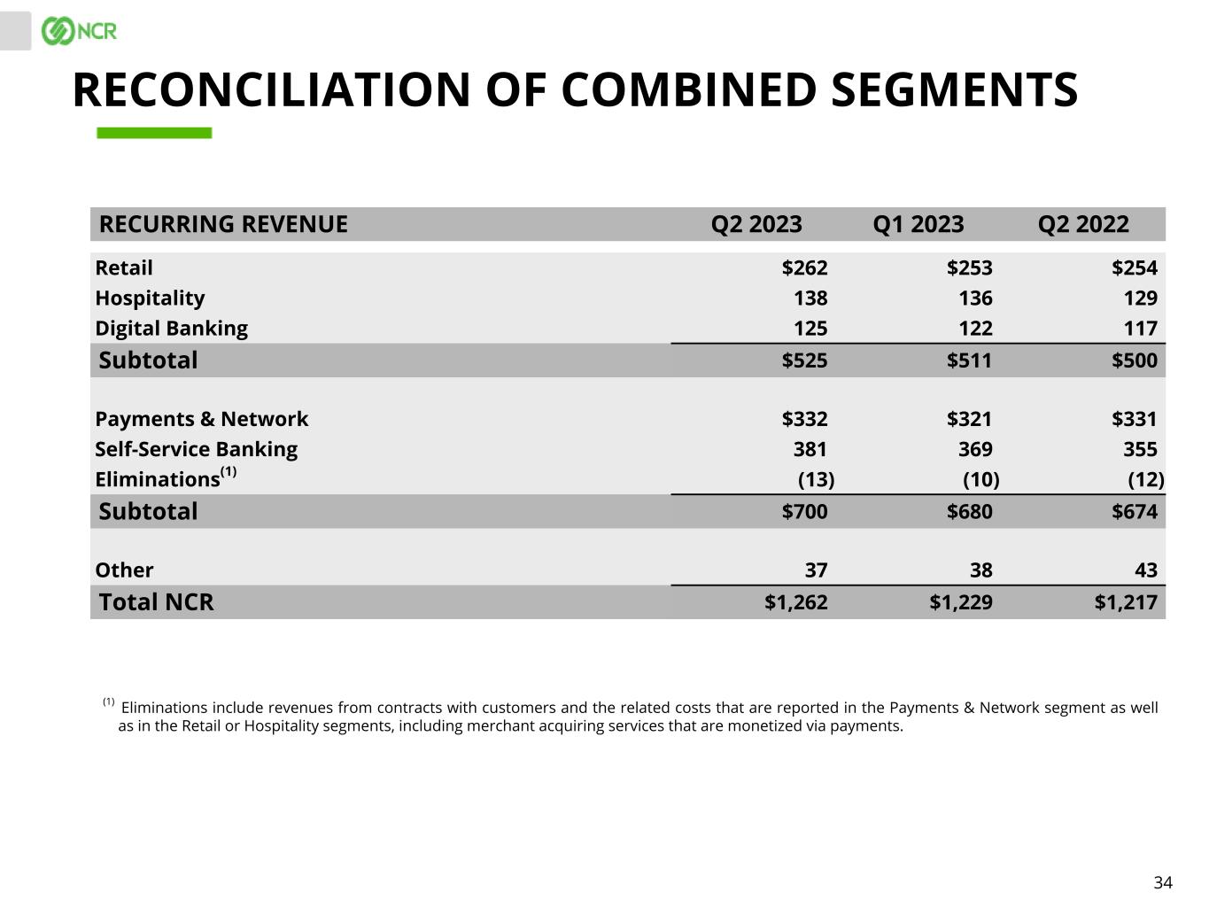 33 REVENUE Q2 2023 Q1 2023 Q2 2022 Retail $576 $552 $562 Hospitality 235 223 238 Digital Banking 140 136 131 Subtotal $951 $911 $931 Payments & Network $333 $323 $332 Self-Service Banking 661 613 679 Eliminations(1) (13) (10) (12) Subtotal $981 $926 $999 Other 54 54 61 Other adjustment(2) — — 6 Total NCR $1,986 $1,891 $1,997 RECONCILIATION OF COMBINED SEGMENTS (1) Eliminations include revenues from contracts with customers and the related costs that are reported in the Payments & Network segment as well as in the Retail or Hospitality segments, including merchant acquiring services that are monetized via payments. (2) Other adjustment reflects the revenue attributable to the Company's operations in Russia for the three months ending June 30, 2022 that were excluded from management's measure of revenue due to our previous announcement to suspend sales to Russia and orderly wind down of our operations in Russia beginning in the first quarter of 2022. Refer to section entitled "Non-GAAP Measures" for additional information.