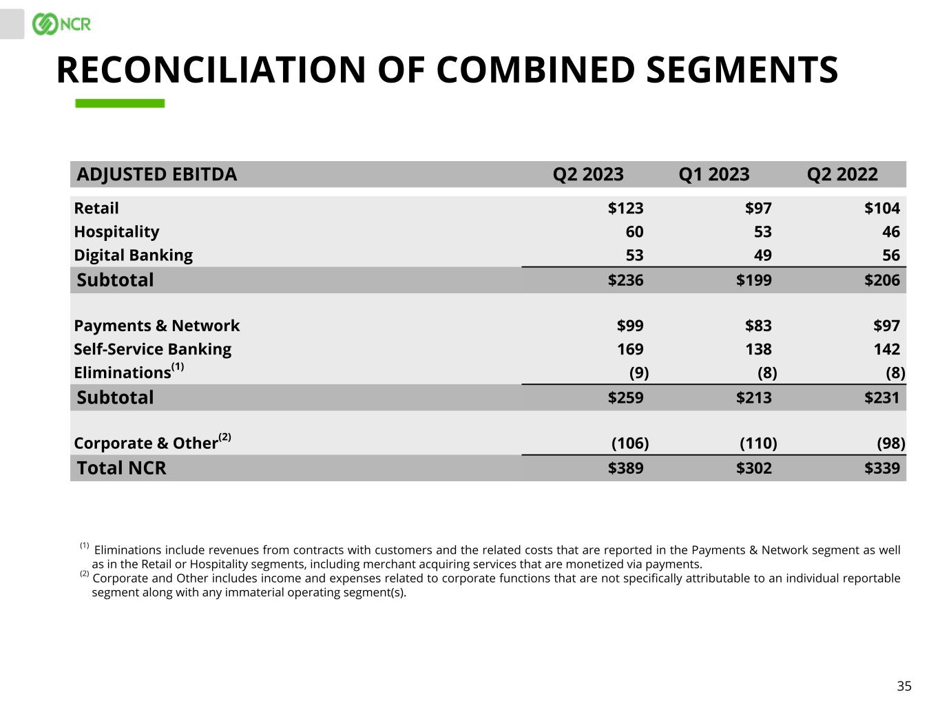34 RECURRING REVENUE Q2 2023 Q1 2023 Q2 2022 Retail $262 $253 $254 Hospitality 138 136 129 Digital Banking 125 122 117 Subtotal $525 $511 $500 Payments & Network $332 $321 $331 Self-Service Banking 381 369 355 Eliminations(1) (13) (10) (12) Subtotal $700 $680 $674 Other 37 38 43 Total NCR $1,262 $1,229 $1,217 RECONCILIATION OF COMBINED SEGMENTS (1) Eliminations include revenues from contracts with customers and the related costs that are reported in the Payments & Network segment as well as in the Retail or Hospitality segments, including merchant acquiring services that are monetized via payments.