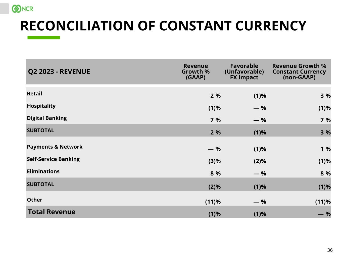 35 ADJUSTED EBITDA Q2 2023 Q1 2023 Q2 2022 Retail $123 $97 $104 Hospitality 60 53 46 Digital Banking 53 49 56 Subtotal $236 $199 $206 Payments & Network $99 $83 $97 Self-Service Banking 169 138 142 Eliminations(1) (9) (8) (8) Subtotal $259 $213 $231 Corporate & Other(2) (106) (110) (98) Total NCR $389 $302 $339 RECONCILIATION OF COMBINED SEGMENTS (1) Eliminations include revenues from contracts with customers and the related costs that are reported in the Payments & Network segment as well as in the Retail or Hospitality segments, including merchant acquiring services that are monetized via payments. (2) Corporate and Other includes income and expenses related to corporate functions that are not specifically attributable to an individual reportable segment along with any immaterial operating segment(s).