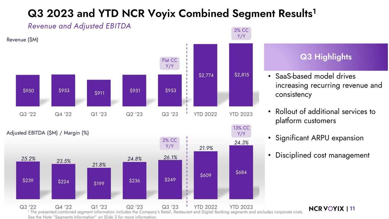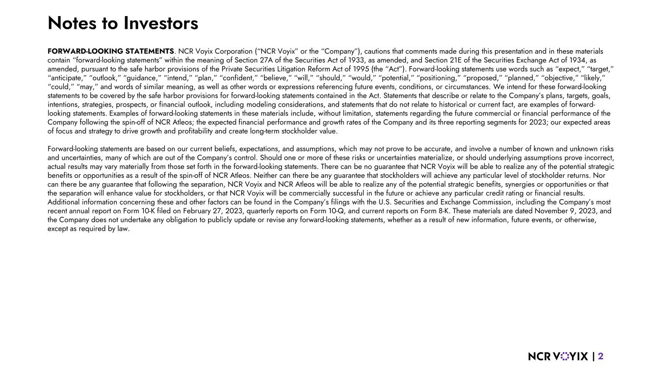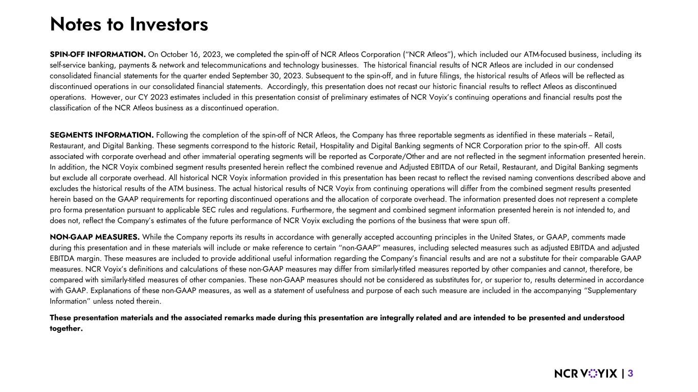 NCR Voyix | 2 Notes to Investors FORWARD-LOOKING STATEMENTS. NCR Voyix Corporation (“NCR Voyix” or the “Company”), cautions that comments made during this presentation and in these materials contain “forward-looking statements” within the meaning of Section 27A of the Securities Act of 1933, as amended, and Section 21E of the Securities Exchange Act of 1934, as amended, pursuant to the safe harbor provisions of the Private Securities Litigation Reform Act of 1995 (the “Act”). Forward-looking statements use words such as “expect,” “target,” “anticipate,” “outlook,” “guidance,” “intend,” “plan,” “confident,” “believe,” “will,” “should,” “would,” “potential,” “positioning,” “proposed,” “planned,” “objective,” “likely,” “could,” “may,” and words of similar meaning, as well as other words or expressions referencing future events, conditions, or circumstances. We intend for these forward-looking statements to be covered by the safe harbor provisions for forward-looking statements contained in the Act. Statements that describe or relate to the Company’s plans, targets, goals, intentions, strategies, prospects, or financial outlook, including modeling considerations, and statements that do not relate to historical or current fact, are examples of forward- looking statements. Examples of forward-looking statements in these materials include, without limitation, statements regarding the future commercial or financial performance of the Company following the spin-off of NCR Atleos; the expected financial performance and growth rates of the Company and its three reporting segments for 2023; our expected areas of focus and strategy to drive growth and profitability and create long-term stockholder value. Forward-looking statements are based on our current beliefs, expectations, and assumptions, which may not prove to be accurate, and involve a number of known and unknown risks and uncertainties, many of which are out of the Company’s control. Should one or more of these risks or uncertainties materialize, or should underlying assumptions prove incorrect, actual results may vary materially from those set forth in the forward-looking statements. There can be no guarantee that NCR Voyix will be able to realize any of the potential strategic benefits or opportunities as a result of the spin-off of NCR Atleos. Neither can there be any guarantee that stockholders will achieve any particular level of stockholder returns. Nor can there be any guarantee that following the separation, NCR Voyix and NCR Atleos will be able to realize any of the potential strategic benefits, synergies or opportunities or that the separation will enhance value for stockholders, or that NCR Voyix will be commercially successful in the future or achieve any particular credit rating or financial results. Additional information concerning these and other factors can be found in the Company’s filings with the U.S. Securities and Exchange Commission, including the Company’s most recent annual report on Form 10-K filed on February 27, 2023, quarterly reports on Form 10-Q, and current reports on Form 8-K. These materials are dated November 9, 2023, and the Company does not undertake any obligation to publicly update or revise any forward-looking statements, whether as a result of new information, future events, or otherwise, except as required by law.