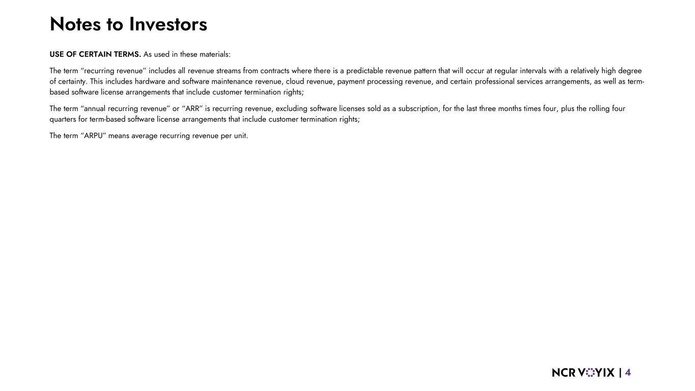 NCR Voyix | 4 Notes to Investors USE OF CERTAIN TERMS. As used in these materials: The term “recurring revenue” includes all revenue streams from contracts where there is a predictable revenue pattern that will occur at regular intervals with a relatively high degree of certainty. This includes hardware and software maintenance revenue, cloud revenue, payment processing revenue, and certain professional services arrangements, as well as term- based software license arrangements that include customer termination rights; The term “annual recurring revenue” or “ARR” is recurring revenue, excluding software licenses sold as a subscription, for the last three months times four, plus the rolling four quarters for term-based software license arrangements that include customer termination rights; The term “ARPU” means average recurring revenue per unit.