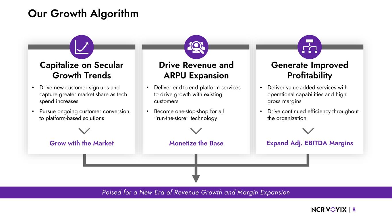 NCR Voyix | 7 NCR Voyix At-a-Glance1 (NYSE: VYX) Market-Leading Software and Services Business with Large, Profitable Recurring Revenue Streams 1 All values presented are CY 2023E, adjusted to exclude: (i) legacy NCR Atleos business for all of 2023 and (ii) full year revenue related to other assets divested in Q4 2023. 2 Source: RBR Data Services, a division of Datos Insights, Global POS Software 2023 report. 3 Ranking as of Q2 2023 public filings by NCR, Q2 (QTWO), and Alkami (ALKT). ~$3.8B Total Revenue ~$2.1B Recurring Revenue ~$2.5B Software and Services Revenue ~17% Adjusted EBITDA Margin 16,000+ employees across 35 countries Revenue Composition 59%24% 15% 2% Retail Restaurant Digital Other Global Composition 69% 15% 9% 7% US EMEA APAC Americas (excl. US) #1 Provider of self-checkout2 Retail #1 Provider of POS software2 #1 User footprint among independent digital banking providers3 Digital Banking &