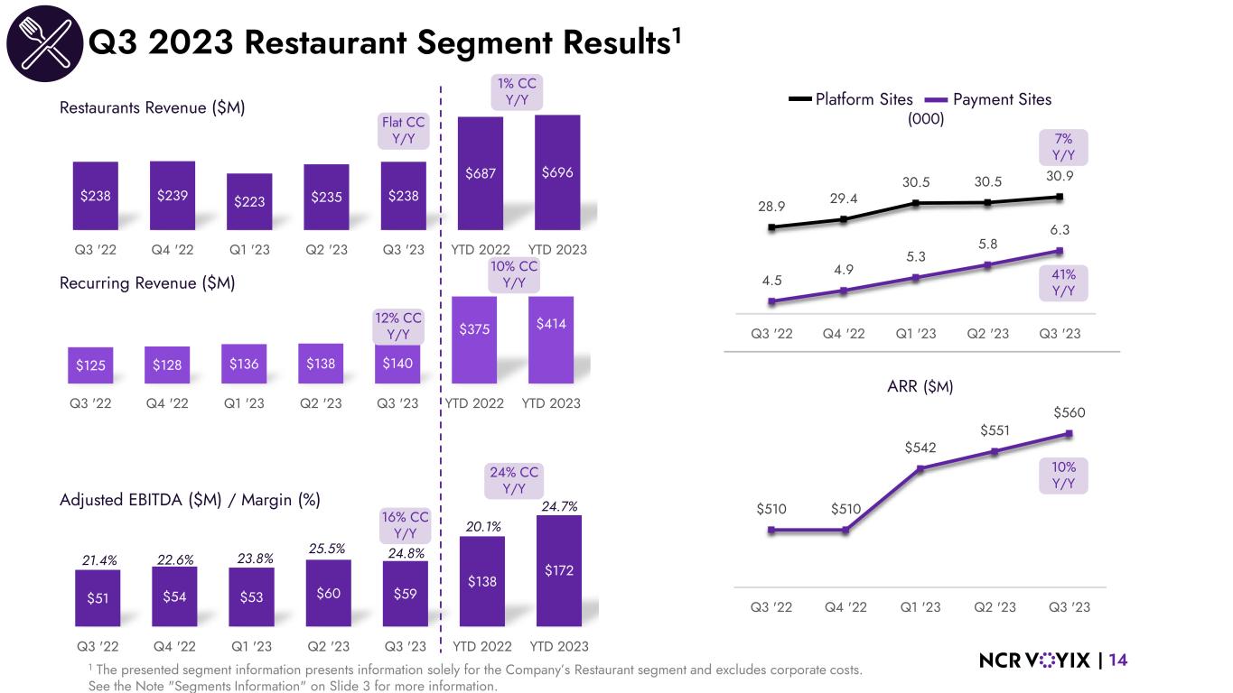 NCR Voyix | 13 Recurring Revenue ($M) Q3 2023 Retail Segment Results1 $128 $116 $97 $123 $132 $299 $352 Q3 '22 Q4 '22 Q1 '23 Q2 '23 Q3 '23 YTD 2022 YTD 2023 20.2% 17.6% 12.5 15.1 21.8 23.4 27.3 Q3 '22 Q4 '22 Q1 '23 Q2 '23 Q3 '23 Platform Sites (000) 21.4% 23.2% 20.8% $1,017 $1,042 $1,017 $1,049 $1,053 Q3 '22 Q4 '22 Q1 '23 Q2 '23 Q3 '23 17.8% 22.3% Adjusted EBITDA ($M) / Margin (%) 4% Y/Y 21% CC Y/Y (1%) CC Y/Y $257 $264 $253 $262 $265 $767 $780 Q3 '22 Q4 '22 Q1 '23 Q2 '23 Q3 '23 YTD 2022 YTD 2023 $575 $575 $552 $576 $568 $1,683 $1,696 Q3 '22 Q4 '22 Q1 '23 Q2 '23 Q3 '23 YTD 2022 YTD 2023 Retail Revenue ($M) (2%) CC Y/Y 118% Y/Y 2% CC Y/Y 3% CC Y/Y 3% CC Y/Y ARR ($M) 1 The presented segment information presents information solely for the Company’s Retail segment and excludes corporate costs. See the Note "Segments Information" on Slide 3 for more information.