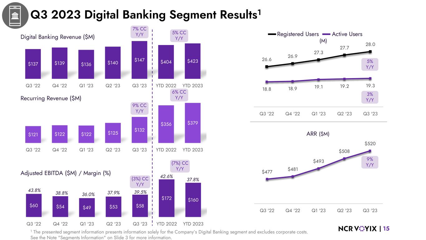 NCR Voyix | 14 4.5 4.9 5.3 5.8 6.3 28.9 29.4 30.5 30.5 30.9 Q3 '22 Q4 '22 Q1 '23 Q2 '23 Q3 '23 Platform Sites Payment Sites (000) $125 $128 $136 $138 $140 $375 $414 Q3 '22 Q4 '22 Q1 '23 Q2 '23 Q3 '23 YTD 2022 YTD 2023 Recurring Revenue ($M) Q3 2023 Restaurant Segment Results1 $51 $54 $53 $60 $59 $138 $172 Q3 '22 Q4 '22 Q1 '23 Q2 '23 Q3 '23 YTD 2022 YTD 2023 22.6% 23.8% 25.5% 24.8% 24.7% $510 $510 $542 $551 $560 Q3 '22 Q4 '22 Q1 '23 Q2 '23 Q3 '23 20.1% 21.4% Adjusted EBITDA ($M) / Margin (%) 10% Y/Y 12% CC Y/Y 10% CC Y/Y 24% CC Y/Y 16% CC Y/Y 7% Y/Y 41% Y/Y $238 $239 $223 $235 $238 $687 $696 Q3 '22 Q4 '22 Q1 '23 Q2 '23 Q3 '23 YTD 2022 YTD 2023 Restaurants Revenue ($M) Flat CC Y/Y 1% CC Y/Y ARR ($M) 1 The presented segment information presents information solely for the Company’s Restaurant segment and excludes corporate costs. See the Note "Segments Information" on Slide 3 for more information.