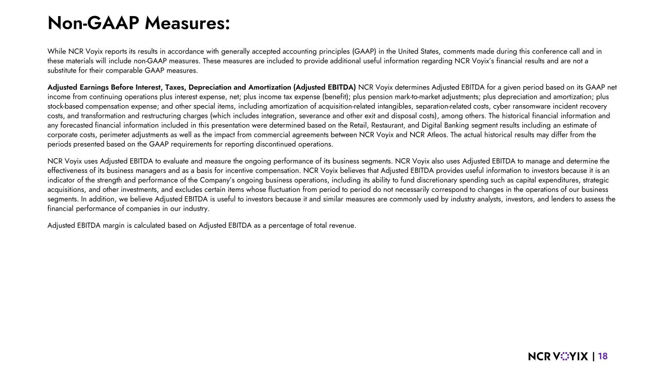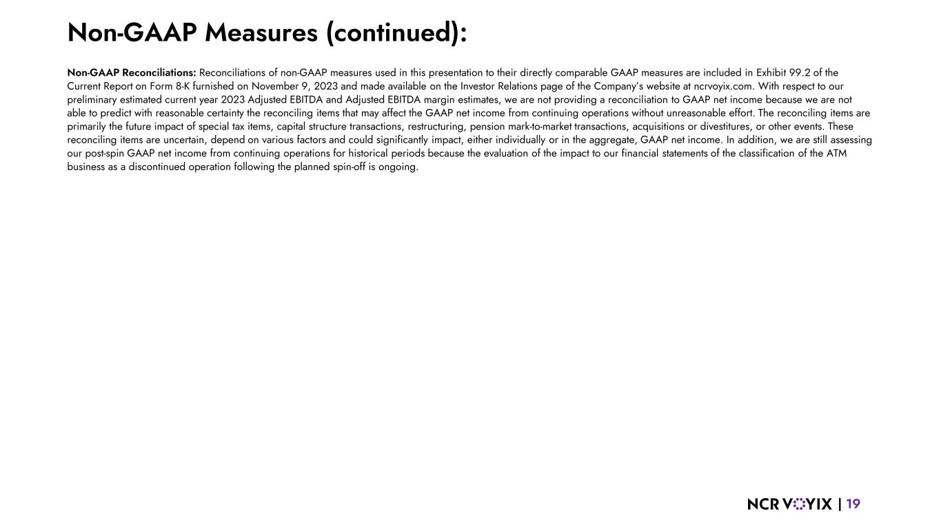 NCR Voyix | 18 Non-GAAP Measures: While NCR Voyix reports its results in accordance with generally accepted accounting principles (GAAP) in the United States, comments made during this conference call and in these materials will include non-GAAP measures. These measures are included to provide additional useful information regarding NCR Voyix’s financial results and are not a substitute for their comparable GAAP measures. Adjusted Earnings Before Interest, Taxes, Depreciation and Amortization (Adjusted EBITDA) NCR Voyix determines Adjusted EBITDA for a given period based on its GAAP net income from continuing operations plus interest expense, net; plus income tax expense (benefit); plus pension mark-to-market adjustments; plus depreciation and amortization; plus stock-based compensation expense; and other special items, including amortization of acquisition-related intangibles, separation-related costs, cyber ransomware incident recovery costs, and transformation and restructuring charges (which includes integration, severance and other exit and disposal costs), among others. The historical financial information and any forecasted financial information included in this presentation were determined based on the Retail, Restaurant, and Digital Banking segment results including an estimate of corporate costs, perimeter adjustments as well as the impact from commercial agreements between NCR Voyix and NCR Atleos. The actual historical results may differ from the periods presented based on the GAAP requirements for reporting discontinued operations. NCR Voyix uses Adjusted EBITDA to evaluate and measure the ongoing performance of its business segments. NCR Voyix also uses Adjusted EBITDA to manage and determine the effectiveness of its business managers and as a basis for incentive compensation. NCR Voyix believes that Adjusted EBITDA provides useful information to investors because it is an indicator of the strength and performance of the Company’s ongoing business operations, including its ability to fund discretionary spending such as capital expenditures, strategic acquisitions, and other investments, and excludes certain items whose fluctuation from period to period do not necessarily correspond to changes in the operations of our business segments. In addition, we believe Adjusted EBITDA is useful to investors because it and similar measures are commonly used by industry analysts, investors, and lenders to assess the financial performance of companies in our industry. Adjusted EBITDA margin is calculated based on Adjusted EBITDA as a percentage of total revenue.
