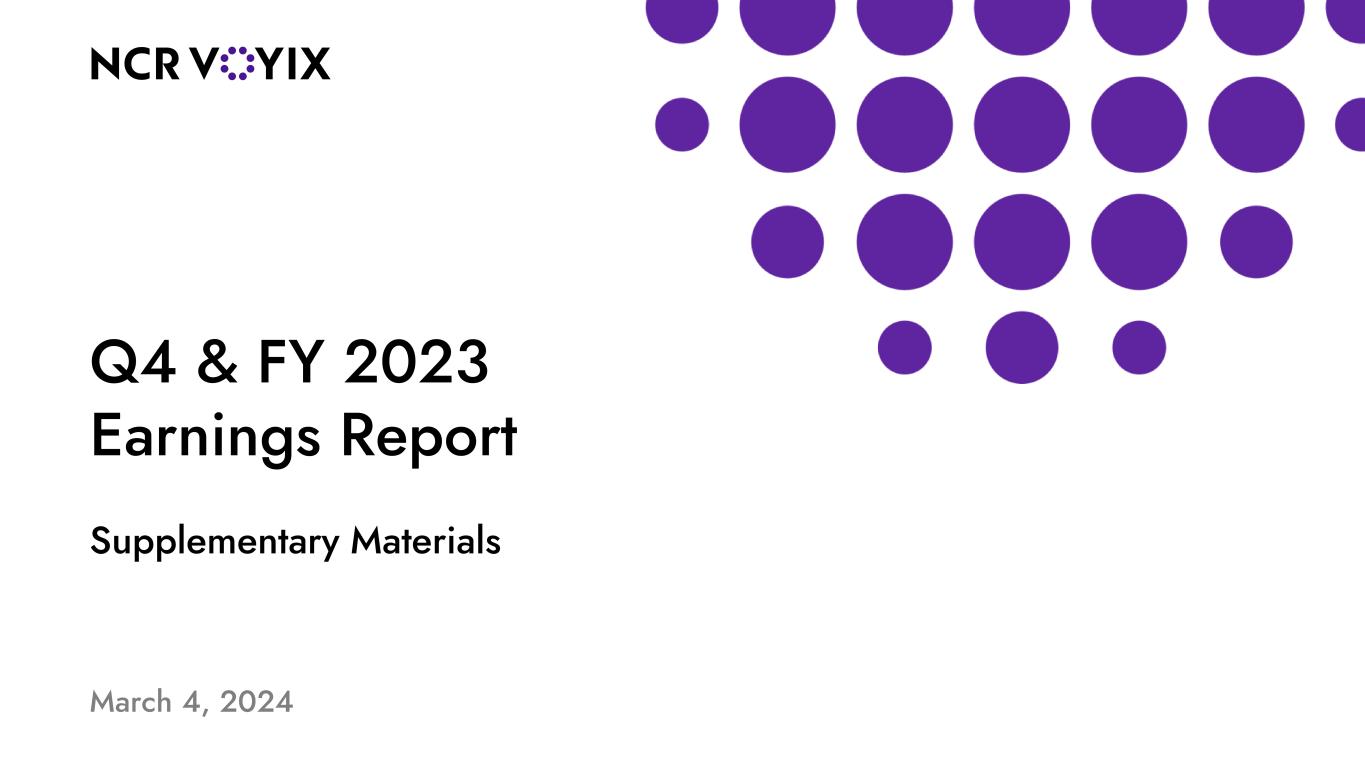 3NYSE :VYX Notes to Investors SPIN-OFF INFORMATION. On October 16, 2023, NCR Voyix completed the spin-off of NCR Atleos Corporation (“NCR Atleos”) as an independent, publicly traded company. The historical financial results of NCR Atleos are reflected as discontinued operations in NCR Voyix’s consolidated financial statements for periods prior to the completion of the spin-off. Accordingly, the financial information included in this presentation and the associated remarks has been recast to reflect the treatment of NCR Atleos as discontinued operations. However, certain costs historically allocated to NCR Atleos do not meet the definition of expenses related to discontinued operations for purposes of GAAP requirements regarding the reporting of discontinued operations. These costs have been included in NCR Voyix’s results from continuing operations, even though NCR Voyix is not expected to incur any additional such costs following completion of the spin-off, and primarily include costs of services and selling, general and administrative expenses. As a result, NCR Voyix’s GAAP and non-GAAP combined segment and consolidated results in this presentation and the associated remarks may not be comparable with estimates previously reported. To address this, NCR Voyix has provided Adjusted EBITDA, which adjusts for these costs. In addition, NCR Voyix was not able to cease all NCR Atleos-related operations in all foreign countries simultaneously with the spin-off. As a result, some of these transfers occurred during the fourth quarter of fiscal 2023 and the first quarter of fiscal 2024, with more expected to occur in the future. Each of these transfers from continuing operations will impact NCR Voyix’s segment and consolidated results as we retrospectively recast historical financial information for additional operations that become categorized as discontinued operations. As a result, NCR Voyix’s GAAP and non-GAAP combined segment and consolidated results in this presentation and the associated remarks and in future public disclosures may not be comparable with estimates previously reported. As a result of discontinued operations treatment and post-2023 transfers and planned transfers of NCR Atleos-related operations in foreign countries, NCR Voyix’s GAAP and non-GAAP combined segment results, segment results and consolidated results in this release may not be comparable with estimates previously reported. To provide enhanced comparability of combined segment results and consolidated results between periods, NCR Voyix has provided Adjusted EBITDA, which adjusts for these items. NON-GAAP MEASURES. While the Company reports its results in accordance with generally accepted accounting principles in the United States, or GAAP, comments made in this presentation include or make reference to certain “non-GAAP” measures, including selected measures such as revenue, Adjusted EBITDA, Adjusted EBITDA margin and Adjusted EPS. These measures are included to provide additional useful information regarding the Company’s financial results and are not a substitute for their comparable GAAP measures. NCR Voyix’s definitions and calculations of these non-GAAP measures may differ from similarly-titled measures reported by other companies and cannot, therefore, be compared with similarly-titled measures of other companies. These non-GAAP measures should not be considered as substitutes for, or superior to, results determined in accordance with GAAP. Explanations of these non-GAAP measures, as well as a statement of usefulness and purpose of each such measure are included in the appendix of this presentation.