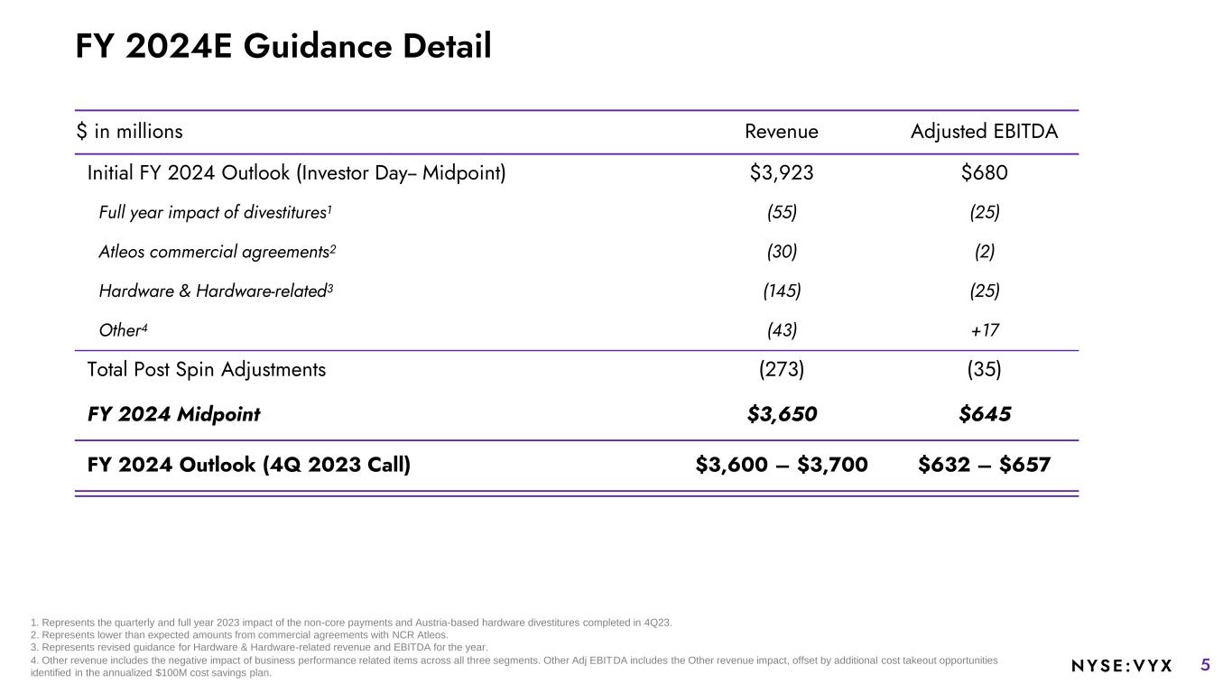 4NYSE :VYX METRIC FY 2024E Total Revenue $3,600M – $3,700M Software & Services Revenue $2,700M – $2,750M Hardware Revenue $900M – $950M Adjusted EBITDA $632M – $657M Adjusted EBITDA Margin 17.5% – 17.7% Adjusted EPS $0.84 – $0.94 Free Cash Flow $155M – $185M Non-GAAP Tax Rate 27% – 29% FY 2024 Guidance