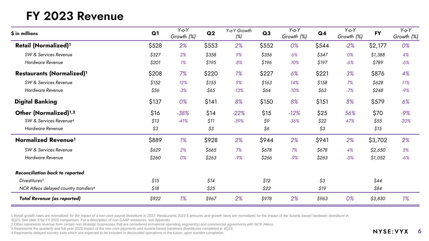 5NYSE :VYX FY 2024E Guidance Detail 1. Represents the quarterly and full year 2023 impact of the non-core payments and Austria-based hardware divestitures completed in 4Q23. 2. Represents lower than expected amounts from commercial agreements with NCR Atleos. 3. Represents revised guidance for Hardware & Hardware-related revenue and EBITDA for the year. 4. Other revenue includes the negative impact of business performance related items across all three segments. Other Adj EBITDA includes the Other revenue impact, offset by additional cost takeout opportunities identified in the annualized $100M cost savings plan. $ in millions Revenue Adjusted EBITDA Initial FY 2024 Outlook (Investor Day-- Midpoint) $3,923 $680 Full year impact of divestitures1 (55) (25) Atleos commercial agreements2 (30) (2) Hardware & Hardware-related3 (145) (25) Other4 (43) +17 Total Post Spin Adjustments (273) (35) FY 2024 Midpoint $3,650 $645 FY 2024 Outlook (4Q 2023 Call) $3,600 – $3,700 $632 – $657