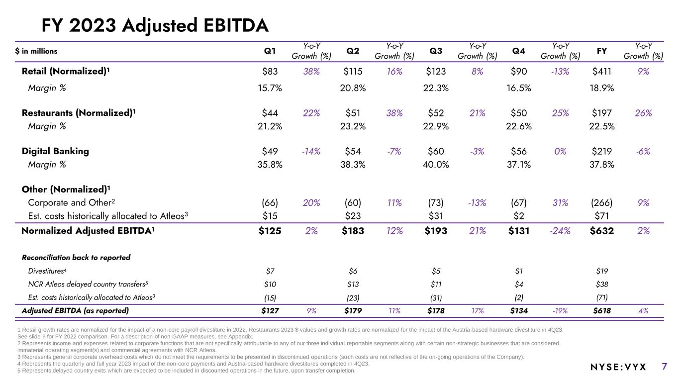 6NYSE :VYX $ in millions Q1 Y-o-Y Growth (%) Q2 Y-o-Y Growth (%) Q3 Y-o-Y Growth (%) Q4 Y-o-Y Growth (%) FY Y-o-Y Growth (%) Retail (Normalized)1 $528 2% $553 2% $552 0% $544 -2% $2,177 0% SW & Services Revenue $327 2% $358 9% $356 6% $347 0% $1,388 4% Hardware Revenue $201 1% $195 -8% $196 -10% $197 -6% $789 -6% Restaurants (Normalized)1 $208 7% $220 1% $227 6% $221 3% $876 4% SW & Services Revenue $152 12% $155 9% $163 14% $158 7% $628 11% Hardware Revenue $56 -3% $65 -13% $64 -10% $63 -7% $248 -9% Digital Banking $137 0% $141 8% $150 8% $151 8% $579 6% Other (Normalized)1,2 $16 -38% $14 -22% $15 -12% $25 56% $70 -9% SW & Services Revenue4 $13 -41% $11 -39% $9 -36% $22 47% $55 -20% Hardware Revenue $3 $3 $6 $3 $15 Normalized Revenue1 $889 1% $928 2% $944 2% $941 2% $3,702 2% SW & Services Revenue $629 2% $665 7% $678 7% $678 4% $2,650 5% Hardware Revenue $260 0% $263 -9% $266 -9% $263 -5% $1,052 -6% Reconciliation back to reported Divestitures3 $15 $14 $12 $3 $44 NCR Atleos delayed country transfers4 $18 $25 $22 $19 $84 Total Revenue (as reported) $922 1% $967 2% $978 2% $963 0% $3,830 1% 1 Retail growth rates are normalized for the impact of a non-core payroll divestiture in 2022. Restaurants 2023 $ amounts and growth rates are normalized for the impact of the Austria-based hardware divestiture in 4Q23. See slide 8 for FY 2022 comparison. For a description of non-GAAP measures, see Appendix. 2 Other represents revenue from certain non-strategic businesses that are considered immaterial operating segment(s) and commercial agreements with NCR Atleos. 3 Represents the quarterly and full year 2023 impact of the non-core payments and Austria-based hardware divestitures completed in 4Q23. 4 Represents delayed country exits which are expected to be included in discounted operations in the future, upon transfer completion. FY 2023 Revenue