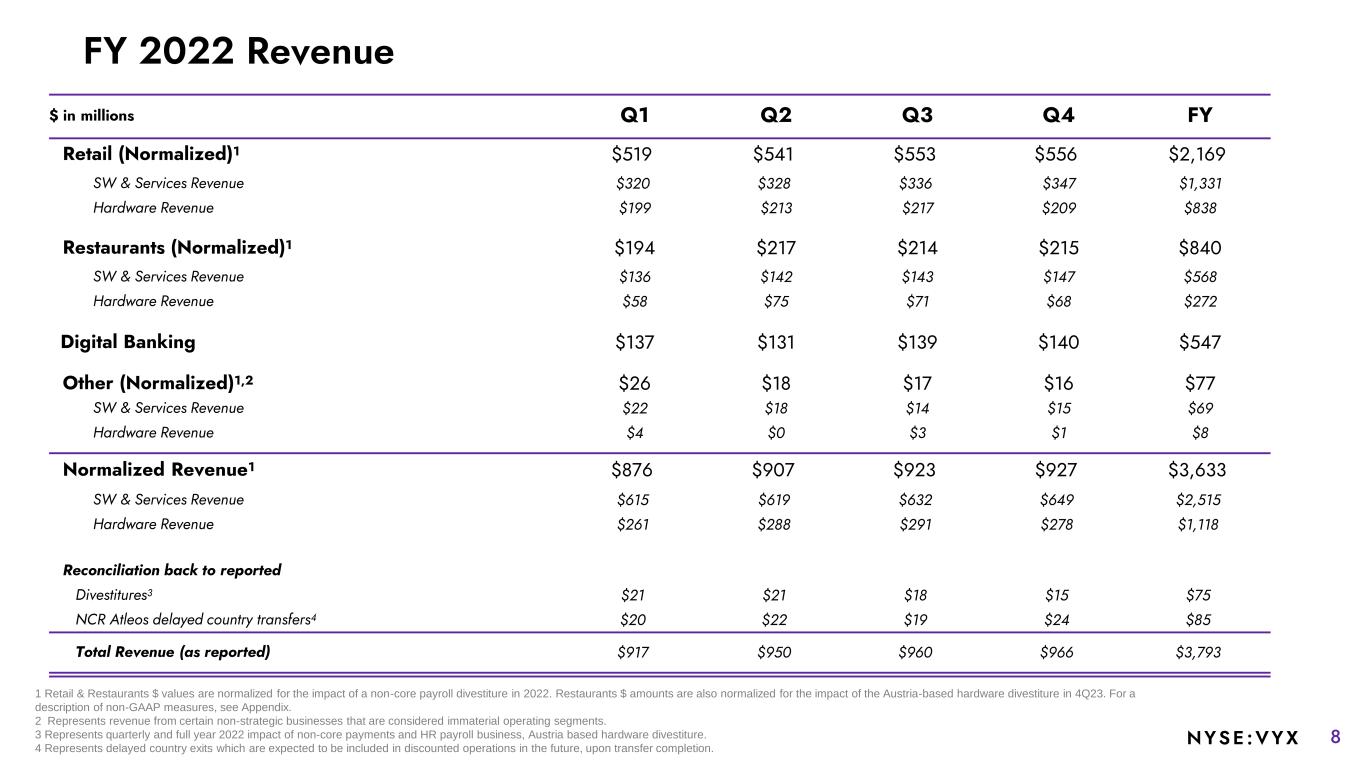 7NYSE :VYX 1 Retail growth rates are normalized for the impact of a non-core payroll divestiture in 2022. Restaurants 2023 $ values and growth rates are normalized for the impact of the Austria-based hardware divestiture in 4Q23. See slide 9 for FY 2022 comparison. For a description of non-GAAP measures, see Appendix. 2 Represents income and expenses related to corporate functions that are not specifically attributable to any of our three individual reportable segments along with certain non-strategic businesses that are considered immaterial operating segment(s) and commercial agreements with NCR Atleos. 3 Represents general corporate overhead costs which do not meet the requirements to be presented in discontinued operations (such costs are not reflective of the on-going operations of the Company). 4 Represents the quarterly and full year 2023 impact of the non-core payments and Austria-based hardware divestitures completed in 4Q23. 5 Represents delayed country exits which are expected to be included in discounted operations in the future, upon transfer completion. FY 2023 Adjusted EBITDA $ in millions Q1 Y-o-Y Growth (%) Q2 Y-o-Y Growth (%) Q3 Y-o-Y Growth (%) Q4 Y-o-Y Growth (%) FY Y-o-Y Growth (%) Retail (Normalized)1 $83 38% $115 16% $123 8% $90 -13% $411 9% Margin % 15.7% 20.8% 22.3% 16.5% 18.9% Restaurants (Normalized)1 $44 22% $51 38% $52 21% $50 25% $197 26% Margin % 21.2% 23.2% 22.9% 22.6% 22.5% Digital Banking $49 -14% $54 -7% $60 -3% $56 0% $219 -6% Margin % 35.8% 38.3% 40.0% 37.1% 37.8% Other (Normalized)1 Corporate and Other2 (66) 20% (60) 11% (73) -13% (67) 31% (266) 9% Est. costs historically allocated to Atleos3 $15 $23 $31 $2 $71 Normalized Adjusted EBITDA1 $125 2% $183 12% $193 21% $131 -24% $632 2% Reconciliation back to reported Divestitures4 $7 $6 $5 $1 $19 NCR Atleos delayed country transfers5 $10 $13 $11 $4 $38 Est. costs historically allocated to Atleos3 (15) (23) (31) (2) (71) Adjusted EBITDA (as reported) $127 9% $179 11% $178 17% $134 -19% $618 4%