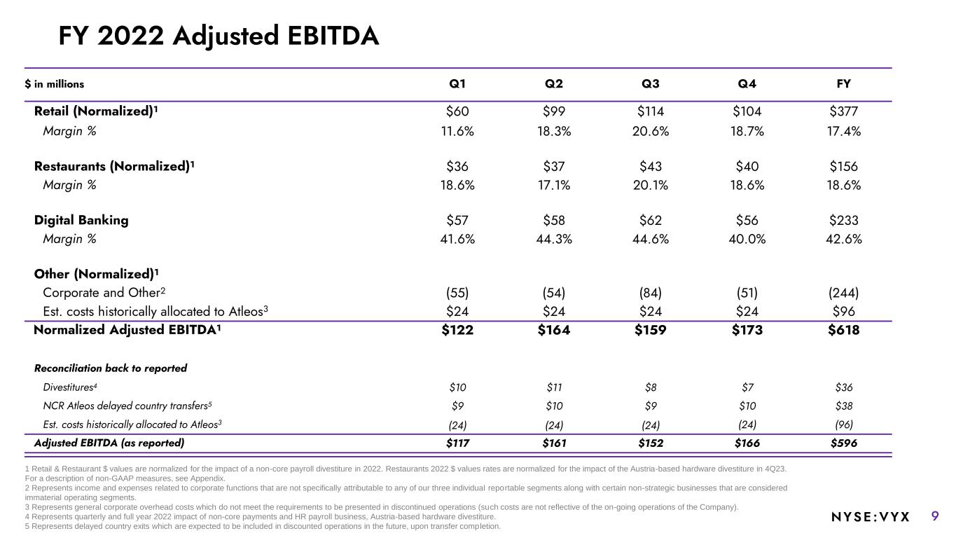 8NYSE :VYX $ in millions Q1 Q2 Q3 Q4 FY Retail (Normalized)1 $519 $541 $553 $556 $2,169 SW & Services Revenue $320 $328 $336 $347 $1,331 Hardware Revenue $199 $213 $217 $209 $838 Restaurants (Normalized)1 $194 $217 $214 $215 $840 SW & Services Revenue $136 $142 $143 $147 $568 Hardware Revenue $58 $75 $71 $68 $272 Digital Banking $137 $131 $139 $140 $547 Other (Normalized)1,2 $26 $18 $17 $16 $77 SW & Services Revenue $22 $18 $14 $15 $69 Hardware Revenue $4 $0 $3 $1 $8 Normalized Revenue1 $876 $907 $923 $927 $3,633 SW & Services Revenue $615 $619 $632 $649 $2,515 Hardware Revenue $261 $288 $291 $278 $1,118 Reconciliation back to reported Divestitures3 $21 $21 $18 $15 $75 NCR Atleos delayed country transfers4 $20 $22 $19 $24 $85 Total Revenue (as reported) $917 $950 $960 $966 $3,793 1 Retail & Restaurants $ values are normalized for the impact of a non-core payroll divestiture in 2022. Restaurants $ amounts are also normalized for the impact of the Austria-based hardware divestiture in 4Q23. For a description of non-GAAP measures, see Appendix. 2 Represents revenue from certain non-strategic businesses that are considered immaterial operating segments. 3 Represents quarterly and full year 2022 impact of non-core payments and HR payroll business, Austria based hardware divestiture. 4 Represents delayed country exits which are expected to be included in discounted operations in the future, upon transfer completion. FY 2022 Revenue