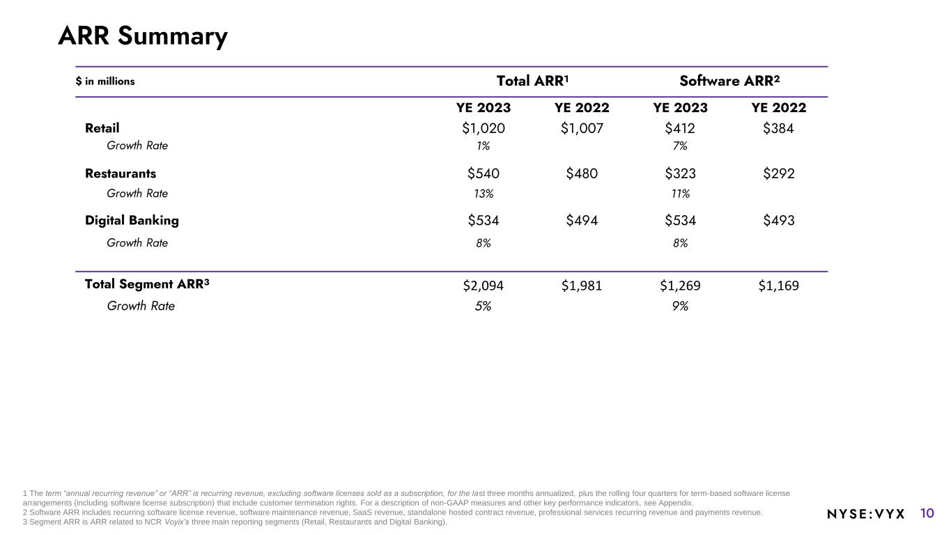 9NYSE :VYX $ in millions Q1 Q2 Q3 Q4 FY Retail (Normalized)1 $60 $99 $114 $104 $377 Margin % 11.6% 18.3% 20.6% 18.7% 17.4% Restaurants (Normalized)1 $36 $37 $43 $40 $156 Margin % 18.6% 17.1% 20.1% 18.6% 18.6% Digital Banking $57 $58 $62 $56 $233 Margin % 41.6% 44.3% 44.6% 40.0% 42.6% Other (Normalized)1 Corporate and Other2 (55) (54) (84) (51) (244) Est. costs historically allocated to Atleos3 $24 $24 $24 $24 $96 Normalized Adjusted EBITDA1 $122 $164 $159 $173 $618 Reconciliation back to reported Divestitures4 $10 $11 $8 $7 $36 NCR Atleos delayed country transfers5 $9 $10 $9 $10 $38 Est. costs historically allocated to Atleos3 (24) (24) (24) (24) (96) Adjusted EBITDA (as reported) $117 $161 $152 $166 $596 1 Retail & Restaurant $ values are normalized for the impact of a non-core payroll divestiture in 2022. Restaurants 2022 $ values rates are normalized for the impact of the Austria-based hardware divestiture in 4Q23. For a description of non-GAAP measures, see Appendix. 2 Represents income and expenses related to corporate functions that are not specifically attributable to any of our three individual reportable segments along with certain non-strategic businesses that are considered immaterial operating segments. 3 Represents general corporate overhead costs which do not meet the requirements to be presented in discontinued operations (such costs are not reflective of the on-going operations of the Company). 4 Represents quarterly and full year 2022 impact of non-core payments and HR payroll business, Austria-based hardware divestiture. 5 Represents delayed country exits which are expected to be included in discounted operations in the future, upon transfer completion. FY 2022 Adjusted EBITDA