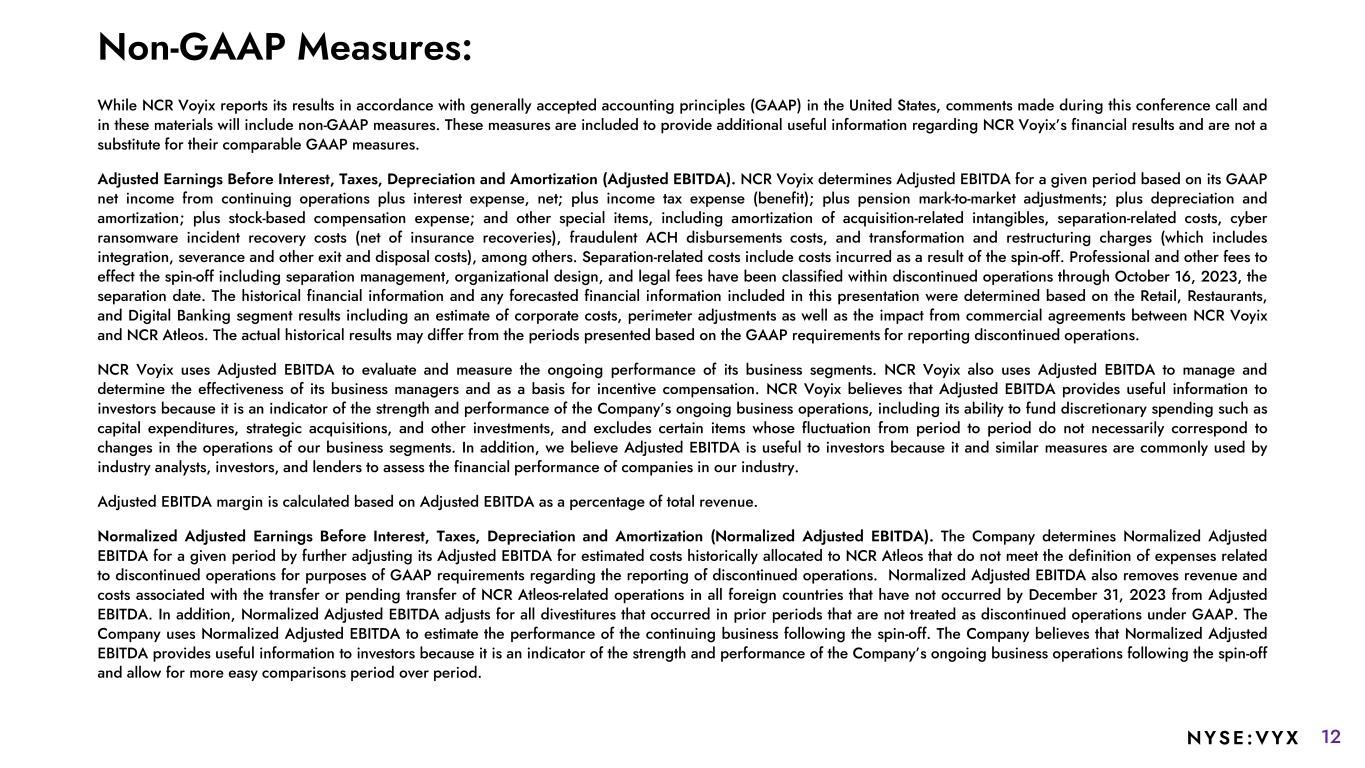 12NYSE :VYX Non-GAAP Measures: While NCR Voyix reports its results in accordance with generally accepted accounting principles (GAAP) in the United States, comments made during this conference call and in these materials will include non-GAAP measures. These measures are included to provide additional useful information regarding NCR Voyix’s financial results and are not a substitute for their comparable GAAP measures. Adjusted Earnings Before Interest, Taxes, Depreciation and Amortization (Adjusted EBITDA). NCR Voyix determines Adjusted EBITDA for a given period based on its GAAP net income from continuing operations plus interest expense, net; plus income tax expense (benefit); plus pension mark-to-market adjustments; plus depreciation and amortization; plus stock-based compensation expense; and other special items, including amortization of acquisition-related intangibles, separation-related costs, cyber ransomware incident recovery costs (net of insurance recoveries), fraudulent ACH disbursements costs, and transformation and restructuring charges (which includes integration, severance and other exit and disposal costs), among others. Separation-related costs include costs incurred as a result of the spin-off. Professional and other fees to effect the spin-off including separation management, organizational design, and legal fees have been classified within discontinued operations through October 16, 2023, the separation date. The historical financial information and any forecasted financial information included in this presentation were determined based on the Retail, Restaurants, and Digital Banking segment results including an estimate of corporate costs, perimeter adjustments as well as the impact from commercial agreements between NCR Voyix and NCR Atleos. The actual historical results may differ from the periods presented based on the GAAP requirements for reporting discontinued operations. NCR Voyix uses Adjusted EBITDA to evaluate and measure the ongoing performance of its business segments. NCR Voyix also uses Adjusted EBITDA to manage and determine the effectiveness of its business managers and as a basis for incentive compensation. NCR Voyix believes that Adjusted EBITDA provides useful information to investors because it is an indicator of the strength and performance of the Company’s ongoing business operations, including its ability to fund discretionary spending such as capital expenditures, strategic acquisitions, and other investments, and excludes certain items whose fluctuation from period to period do not necessarily correspond to changes in the operations of our business segments. In addition, we believe Adjusted EBITDA is useful to investors because it and similar measures are commonly used by industry analysts, investors, and lenders to assess the financial performance of companies in our industry. Adjusted EBITDA margin is calculated based on Adjusted EBITDA as a percentage of total revenue. Normalized Adjusted Earnings Before Interest, Taxes, Depreciation and Amortization (Normalized Adjusted EBITDA). The Company determines Normalized Adjusted EBITDA for a given period by further adjusting its Adjusted EBITDA for estimated costs historically allocated to NCR Atleos that do not meet the definition of expenses related to discontinued operations for purposes of GAAP requirements regarding the reporting of discontinued operations. Normalized Adjusted EBITDA also removes revenue and costs associated with the transfer or pending transfer of NCR Atleos-related operations in all foreign countries that have not occurred by December 31, 2023 from Adjusted EBITDA. In addition, Normalized Adjusted EBITDA adjusts for all divestitures that occurred in prior periods that are not treated as discontinued operations under GAAP. The Company uses Normalized Adjusted EBITDA to estimate the performance of the continuing business following the spin-off. The Company believes that Normalized Adjusted EBITDA provides useful information to investors because it is an indicator of the strength and performance of the Company’s ongoing business operations following the spin-off and allow for more easy comparisons period over period.