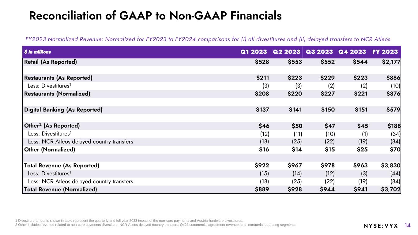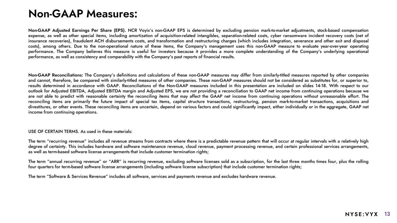 13NYSE :VYX Non-GAAP Measures: Non-GAAP Adjusted Earnings Per Share (EPS). NCR Voyix’s non-GAAP EPS is determined by excluding pension mark-to-market adjustments, stock-based compensation expense, as well as other special items, including amortization of acquisition-related intangibles, separation-related costs, cyber ransomware incident recovery costs (net of insurance recoveries), fraudulent ACH disbursements costs, and transformation and restructuring charges (which includes integration, severance and other exit and disposal costs), among others. Due to the non-operational nature of these items, the Company's management uses this non-GAAP measure to evaluate year-over-year operating performance. The Company believes this measure is useful for investors because it provides a more complete understanding of the Company's underlying operational performance, as well as consistency and comparability with the Company's past reports of financial results. Non-GAAP Reconciliations: The Company’s definitions and calculations of these non-GAAP measures may differ from similarly-titled measures reported by other companies and cannot, therefore, be compared with similarly-titled measures of other companies. These non-GAAP measures should not be considered as substitutes for, or superior to, results determined in accordance with GAAP. Reconciliations of the Non-GAAP measures included in this presentation are included on slides 14-18. With respect to our outlook for Adjusted EBITDA, Adjusted EBITDA margin and Adjusted EPS, we are not providing a reconciliation to GAAP net income from continuing operations because we are not able to predict with reasonable certainty the reconciling items that may affect the GAAP net income from continuing operations without unreasonable effort. The reconciling items are primarily the future impact of special tax items, capital structure transactions, restructuring, pension mark-to-market transactions, acquisitions and divestitures, or other events. These reconciling items are uncertain, depend on various factors and could significantly impact, either individually or in the aggregate, GAAP net income from continuing operations. USE OF CERTAIN TERMS. As used in these materials: The term “recurring revenue” includes all revenue streams from contracts where there is a predictable revenue pattern that will occur at regular intervals with a relatively high degree of certainty. This includes hardware and software maintenance revenue, cloud revenue, payment processing revenue, and certain professional services arrangements, as well as term-based software license arrangements that include customer termination rights; The term “annual recurring revenue” or “ARR” is recurring revenue, excluding software licenses sold as a subscription, for the last three months times four, plus the rolling four quarters for term-based software license arrangements (including software license subscription) that include customer termination rights; The term “Software & Services Revenue” includes all software, services and payments revenue and excludes hardware revenue.