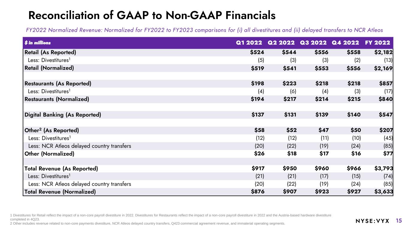 14NYSE :VYX Reconciliation of GAAP to Non-GAAP Financials FY2023 Normalized Revenue: Normalized for FY2023 to FY2024 comparisons for (i) all divestitures and (ii) delayed transfers to NCR Atleos $ in millions Q1 2023 Q2 2023 Q3 2023 Q4 2023 FY 2023 Retail (As Reported) $528 $553 $552 $544 $2,177 Restaurants (As Reported) $211 $223 $229 $223 $886 Less: Divestitures1 (3) (3) (2) (2) (10) Restaurants (Normalized) $208 $220 $227 $221 $876 Digital Banking (As Reported) $137 $141 $150 $151 $579 Other2 (As Reported) $46 $50 $47 $45 $188 Less: Divestitures1 (12) (11) (10) (1) (34) Less: NCR Atleos delayed country transfers (18) (25) (22) (19) (84) Other (Normalized) $16 $14 $15 $25 $70 Total Revenue (As Reported) $922 $967 $978 $963 $3,830 Less: Divestitures1 (15) (14) (12) (3) (44) Less: NCR Atleos delayed country transfers (18) (25) (22) (19) (84) Total Revenue (Normalized) $889 $928 $944 $941 $3,702 1 Divestiture amounts shown in table represent the quarterly and full year 2023 impact of the non-core payments and Austria-hardware divestitures. 2 Other includes revenue related to non-core payments divestiture, NCR Atleos delayed country transfers, Q423 commercial agreement revenue, and immaterial operating segments.