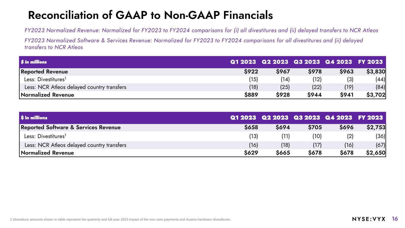 15NYSE :VYX Reconciliation of GAAP to Non-GAAP Financials FY2022 Normalized Revenue: Normalized for FY2022 to FY2023 comparisons for (i) all divestitures and (ii) delayed transfers to NCR Atleos $ in millions Q1 2022 Q2 2022 Q3 2022 Q4 2022 FY 2022 Retail (As Reported) $524 $544 $556 $558 $2,182 Less: Divestitures1 (5) (3) (3) (2) (13) Retail (Normalized) $519 $541 $553 $556 $2,169 Restaurants (As Reported) $198 $223 $218 $218 $857 Less: Divestitures1 (4) (6) (4) (3) (17) Restaurants (Normalized) $194 $217 $214 $215 $840 Digital Banking (As Reported) $137 $131 $139 $140 $547 Other2 (As Reported) $58 $52 $47 $50 $207 Less: Divestitures1 (12) (12) (11) (10) (45) Less: NCR Atleos delayed country transfers (20) (22) (19) (24) (85) Other (Normalized) $26 $18 $17 $16 $77 Total Revenue (As Reported) $917 $950 $960 $966 $3,793 Less: Divestitures1 (21) (21) (17) (15) (74) Less: NCR Atleos delayed country transfers (20) (22) (19) (24) (85) Total Revenue (Normalized) $876 $907 $923 $927 $3,633 1 Divestitures for Retail reflect the impact of a non-core payroll divestiture in 2022. Divestitures for Restaurants reflect the impact of a non-core payroll divestiture in 2022 and the Austria-based hardware divestiture completed in 4Q23. 2 Other includes revenue related to non-core payments divestiture, NCR Atleos delayed country transfers, Q423 commercial agreement revenue, and immaterial operating segments.