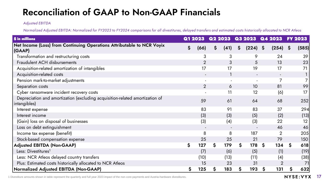 16NYSE :VYX Reconciliation of GAAP to Non-GAAP Financials FY2023 Normalized Revenue: Normalized for FY2023 to FY2024 comparisons for (i) all divestitures and (ii) delayed transfers to NCR Atleos FY2023 Normalized Software & Services Revenue: Normalized for FY2023 to FY2024 comparisons for all divestitures and (ii) delayed transfers to NCR Atleos $ in millions Q1 2023 Q2 2023 Q3 2023 Q4 2023 FY 2023 Reported Revenue $922 $967 $978 $963 $3,830 Less: Divestitures1 (15) (14) (12) (3) (44) Less: NCR Atleos delayed country transfers (18) (25) (22) (19) (84) Normalized Revenue $889 $928 $944 $941 $3,702 1 Divestiture amounts shown in table represent the quarterly and full year 2023 impact of the non-core payments and Austria-hardware divestitures. $ in millions Q1 2023 Q2 2023 Q3 2023 Q4 2023 FY 2023 Reported Software & Services Revenue $658 $694 $705 $696 $2,753 Less: Divestitures1 (13) (11) (10) (2) (36) Less: NCR Atleos delayed country transfers (16) (18) (17) (16) (67) Normalized Revenue $629 $665 $678 $678 $2,650