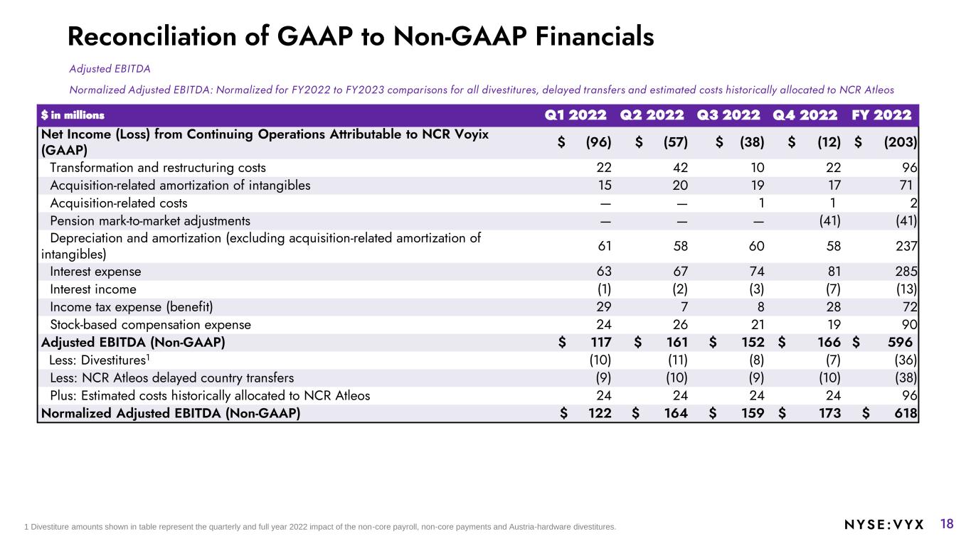 17NYSE :VYX Reconciliation of GAAP to Non-GAAP Financials $ in millions Q1 2023 Q2 2023 Q3 2023 Q4 2023 FY 2023 Net Income (Loss) from Continuing Operations Attributable to NCR Voyix (GAAP) $ (66) $ (41) $ (224) $ (254) $ (585) Transformation and restructuring costs 3 3 9 24 39 Fraudulent ACH disbursements 2 3 5 13 23 Acquisition-related amortization of intangibles 17 17 19 17 71 Acquisition-related costs - 1 - - 1 Pension mark-to-market adjustments - - - 7 7 Separation costs 2 6 10 81 99 Cyber ransomware incident recovery costs - 11 12 (6) 17 Depreciation and amortization (excluding acquisition-related amortization of intangibles) 59 61 64 68 252 Interest expense 83 91 83 37 294 Interest income (3) (3) (5) (2) (13) (Gain) loss on disposal of businesses (3) (4) (3) 22 12 Loss on debt extinguishment - - - 46 46 Income tax expense (benefit) 8 8 187 2 205 Stock-based compensation expense 25 25 21 79 150 Adjusted EBITDA (Non-GAAP) $ 127 $ 179 $ 178 $ 134 $ 618 Less: Divestitures1 (7) (6) (5) (1) (19) Less: NCR Atleos delayed country transfers (10) (13) (11) (4) (38) Plus: Estimated costs historically allocated to NCR Atleos 15 23 31 2 71 Normalized Adjusted EBITDA (Non-GAAP) $ 125 $ 183 $ 193 $ 131 $ 632 Adjusted EBITDA Normalized Adjusted EBITDA: Normalized for FY2023 to FY2024 comparisons for all divestitures, delayed transfers and estimated costs historically allocated to NCR Atleos 1 Divestiture amounts shown in table represent the quarterly and full year 2023 impact of the non-core payments and Austria-hardware divestitures.