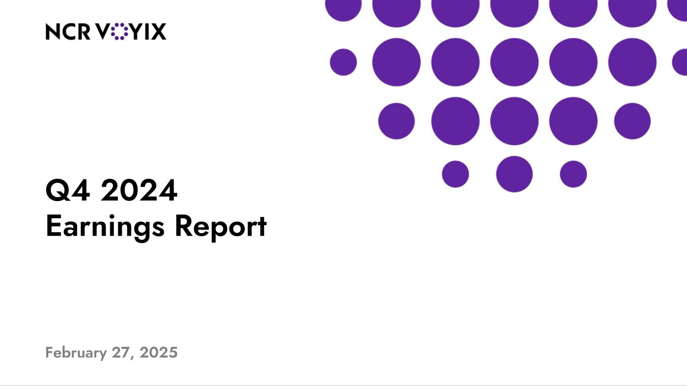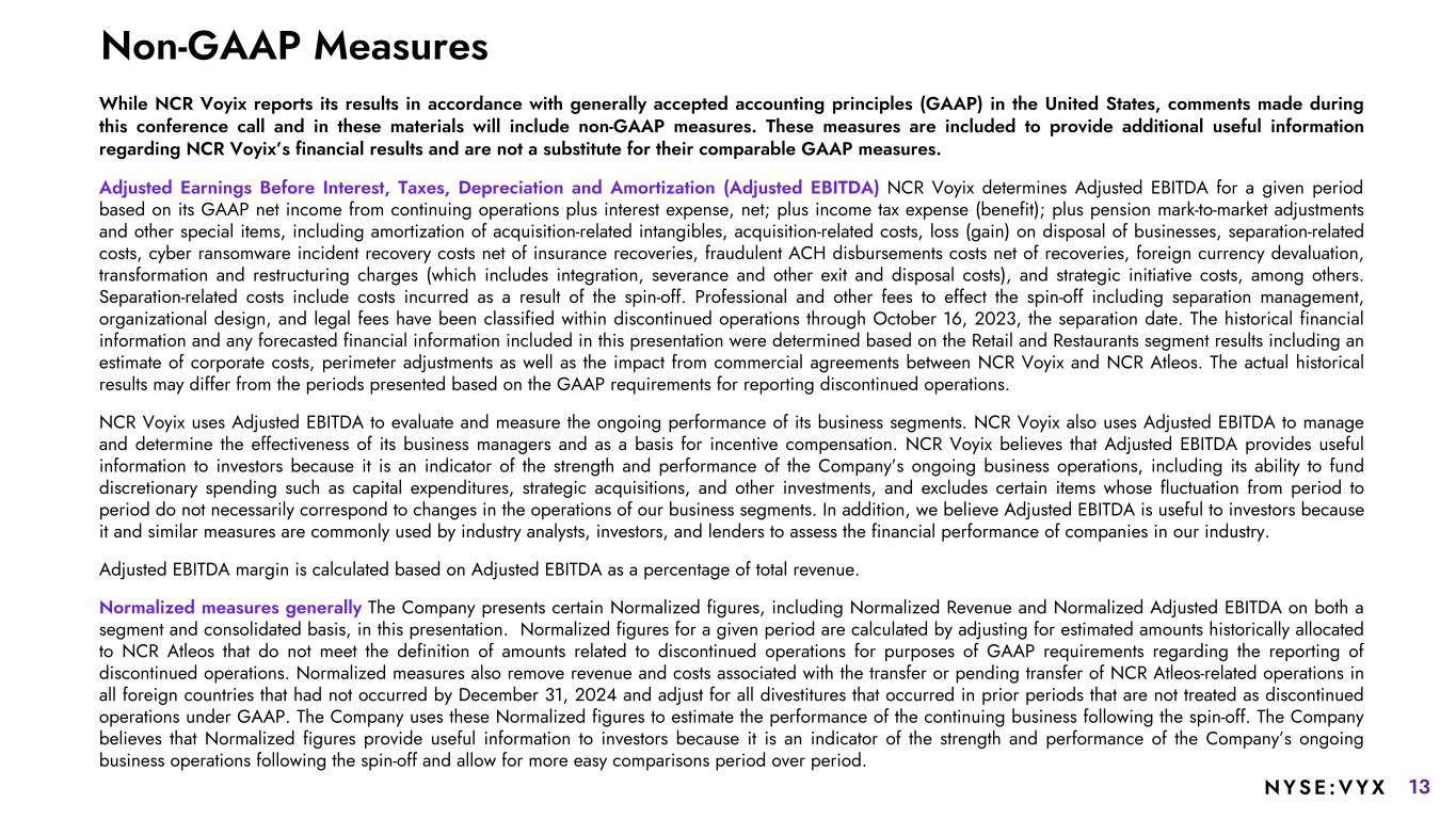 13NYSE :VYX While NCR Voyix reports its results in accordance with generally accepted accounting principles (GAAP) in the United States, comments made during this conference call and in these materials will include non-GAAP measures. These measures are included to provide additional useful information regarding NCR Voyix’s financial results and are not a substitute for their comparable GAAP measures. Adjusted Earnings Before Interest, Taxes, Depreciation and Amortization (Adjusted EBITDA) NCR Voyix determines Adjusted EBITDA for a given period based on its GAAP net income from continuing operations plus interest expense, net; plus income tax expense (benefit); plus pension mark-to-market adjustments and other special items, including amortization of acquisition-related intangibles, acquisition-related costs, loss (gain) on disposal of businesses, separation-related costs, cyber ransomware incident recovery costs net of insurance recoveries, fraudulent ACH disbursements costs net of recoveries, foreign currency devaluation, transformation and restructuring charges (which includes integration, severance and other exit and disposal costs), and strategic initiative costs, among others. Separation-related costs include costs incurred as a result of the spin-off. Professional and other fees to effect the spin-off including separation management, organizational design, and legal fees have been classified within discontinued operations through October 16, 2023, the separation date. The historical financial information and any forecasted financial information included in this presentation were determined based on the Retail and Restaurants segment results including an estimate of corporate costs, perimeter adjustments as well as the impact from commercial agreements between NCR Voyix and NCR Atleos. The actual historical results may differ from the periods presented based on the GAAP requirements for reporting discontinued operations. NCR Voyix uses Adjusted EBITDA to evaluate and measure the ongoing performance of its business segments. NCR Voyix also uses Adjusted EBITDA to manage and determine the effectiveness of its business managers and as a basis for incentive compensation. NCR Voyix believes that Adjusted EBITDA provides useful information to investors because it is an indicator of the strength and performance of the Company’s ongoing business operations, including its ability to fund discretionary spending such as capital expenditures, strategic acquisitions, and other investments, and excludes certain items whose fluctuation from period to period do not necessarily correspond to changes in the operations of our business segments. In addition, we believe Adjusted EBITDA is useful to investors because it and similar measures are commonly used by industry analysts, investors, and lenders to assess the financial performance of companies in our industry. Adjusted EBITDA margin is calculated based on Adjusted EBITDA as a percentage of total revenue. Normalized measures generally The Company presents certain Normalized figures, including Normalized Revenue and Normalized Adjusted EBITDA on both a segment and consolidated basis, in this presentation. Normalized figures for a given period are calculated by adjusting for estimated amounts historically allocated to NCR Atleos that do not meet the definition of amounts related to discontinued operations for purposes of GAAP requirements regarding the reporting of discontinued operations. Normalized measures also remove revenue and costs associated with the transfer or pending transfer of NCR Atleos-related operations in all foreign countries that had not occurred by December 31, 2024 and adjust for all divestitures that occurred in prior periods that are not treated as discontinued operations under GAAP. The Company uses these Normalized figures to estimate the performance of the continuing business following the spin-off. The Company believes that Normalized figures provide useful information to investors because it is an indicator of the strength and performance of the Company’s ongoing business operations following the spin-off and allow for more easy comparisons period over period. Non-GAAP Measures