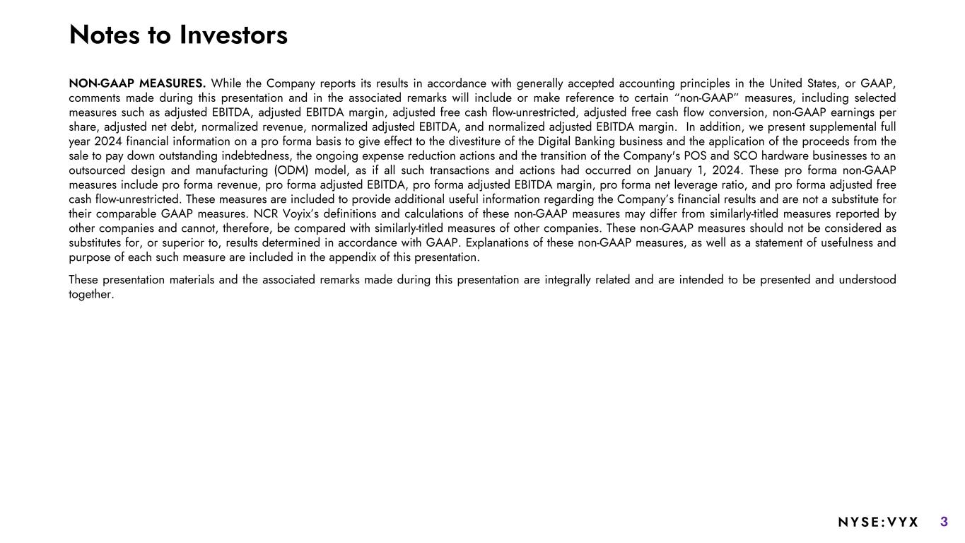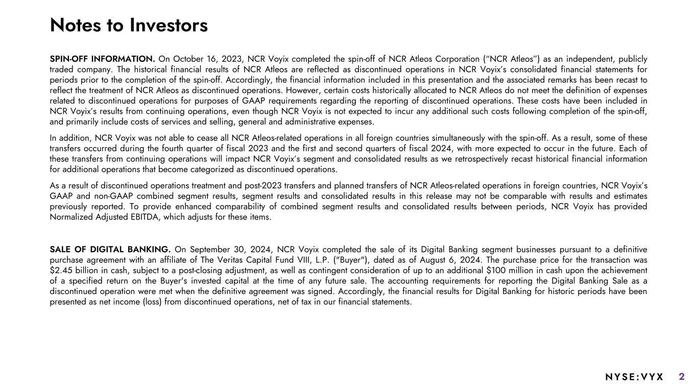 2NYSE :VYX SPIN-OFF INFORMATION. On October 16, 2023, NCR Voyix completed the spin-off of NCR Atleos Corporation (“NCR Atleos”) as an independent, publicly traded company. The historical financial results of NCR Atleos are reflected as discontinued operations in NCR Voyix’s consolidated financial statements for periods prior to the completion of the spin-off. Accordingly, the financial information included in this presentation and the associated remarks has been recast to reflect the treatment of NCR Atleos as discontinued operations. However, certain costs historically allocated to NCR Atleos do not meet the definition of expenses related to discontinued operations for purposes of GAAP requirements regarding the reporting of discontinued operations. These costs have been included in NCR Voyix’s results from continuing operations, even though NCR Voyix is not expected to incur any additional such costs following completion of the spin-off, and primarily include costs of services and selling, general and administrative expenses. In addition, NCR Voyix was not able to cease all NCR Atleos-related operations in all foreign countries simultaneously with the spin-off. As a result, some of these transfers occurred during the fourth quarter of fiscal 2023 and the first and second quarters of fiscal 2024, with more expected to occur in the future. Each of these transfers from continuing operations will impact NCR Voyix’s segment and consolidated results as we retrospectively recast historical financial information for additional operations that become categorized as discontinued operations. As a result of discontinued operations treatment and post-2023 transfers and planned transfers of NCR Atleos-related operations in foreign countries, NCR Voyix’s GAAP and non-GAAP combined segment results, segment results and consolidated results in this release may not be comparable with results and estimates previously reported. To provide enhanced comparability of combined segment results and consolidated results between periods, NCR Voyix has provided Normalized Adjusted EBITDA, which adjusts for these items. SALE OF DIGITAL BANKING. On September 30, 2024, NCR Voyix completed the sale of its Digital Banking segment businesses pursuant to a definitive purchase agreement with an affiliate of The Veritas Capital Fund VIII, L.P. ("Buyer"), dated as of August 6, 2024. The purchase price for the transaction was $2.45 billion in cash, subject to a post-closing adjustment, as well as contingent consideration of up to an additional $100 million in cash upon the achievement of a specified return on the Buyer's invested capital at the time of any future sale. The accounting requirements for reporting the Digital Banking Sale as a discontinued operation were met when the definitive agreement was signed. Accordingly, the financial results for Digital Banking for historic periods have been presented as net income (loss) from discontinued operations, net of tax in our financial statements. Notes to Investors