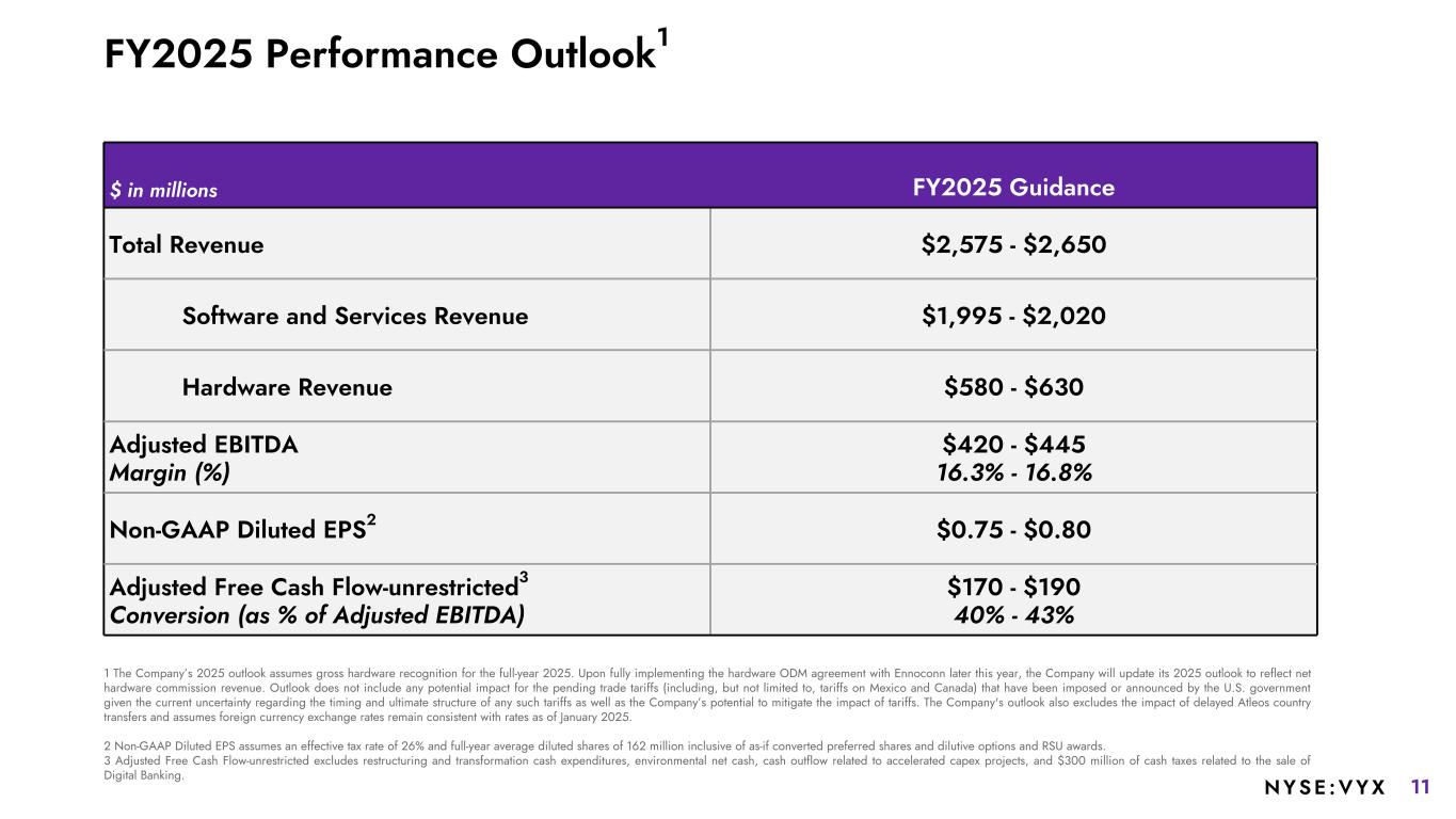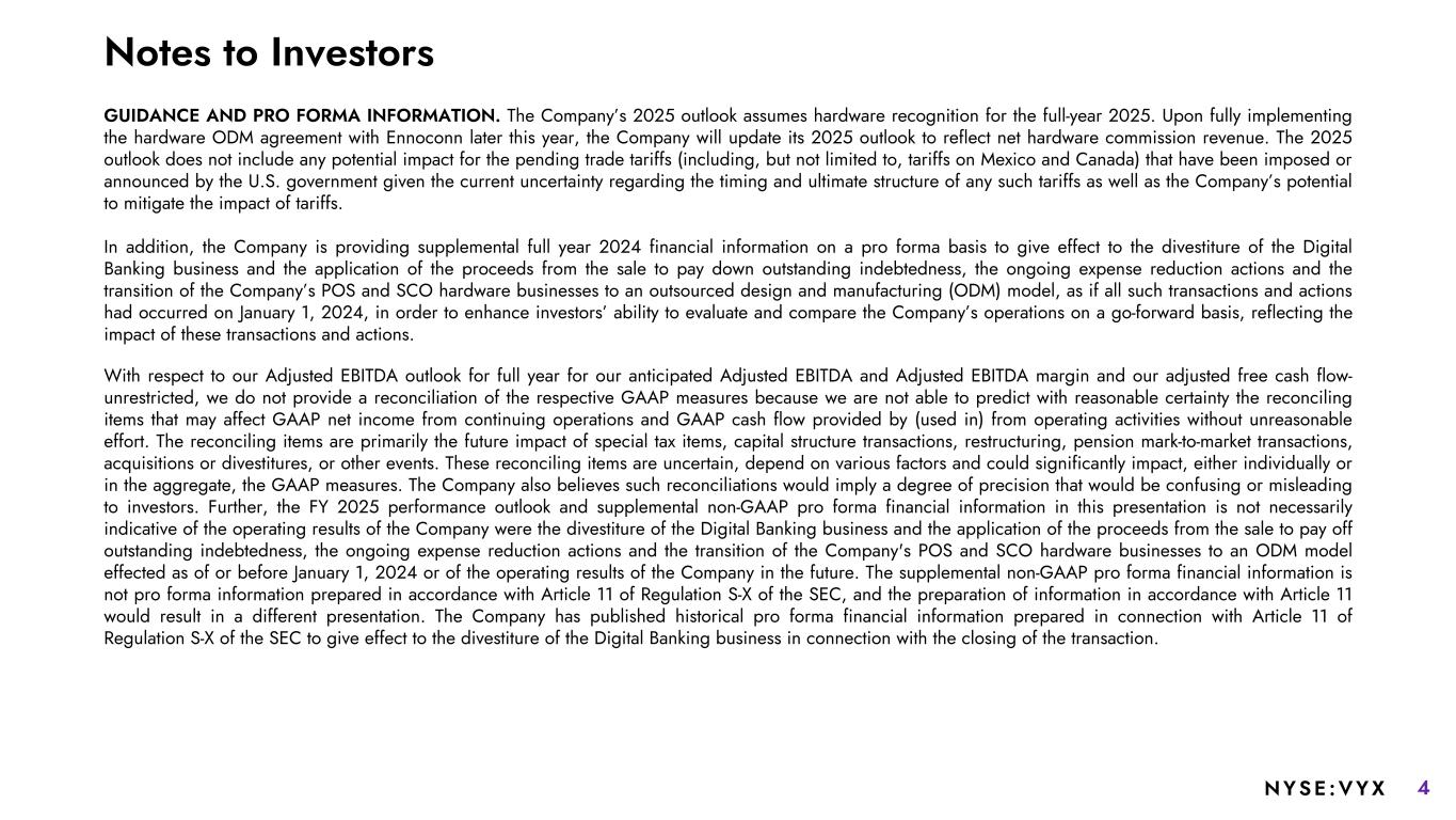 4NYSE :VYX Notes to Investors GUIDANCE AND PRO FORMA INFORMATION. The Company’s 2025 outlook assumes hardware recognition for the full-year 2025. Upon fully implementing the hardware ODM agreement with Ennoconn later this year, the Company will update its 2025 outlook to reflect net hardware commission revenue. The 2025 outlook does not include any potential impact for the pending trade tariffs (including, but not limited to, tariffs on Mexico and Canada) that have been imposed or announced by the U.S. government given the current uncertainty regarding the timing and ultimate structure of any such tariffs as well as the Company’s potential to mitigate the impact of tariffs. In addition, the Company is providing supplemental full year 2024 financial information on a pro forma basis to give effect to the divestiture of the Digital Banking business and the application of the proceeds from the sale to pay down outstanding indebtedness, the ongoing expense reduction actions and the transition of the Company’s POS and SCO hardware businesses to an outsourced design and manufacturing (ODM) model, as if all such transactions and actions had occurred on January 1, 2024, in order to enhance investors’ ability to evaluate and compare the Company’s operations on a go-forward basis, reflecting the impact of these transactions and actions. With respect to our Adjusted EBITDA outlook for full year for our anticipated Adjusted EBITDA and Adjusted EBITDA margin and our adjusted free cash flow- unrestricted, we do not provide a reconciliation of the respective GAAP measures because we are not able to predict with reasonable certainty the reconciling items that may affect GAAP net income from continuing operations and GAAP cash flow provided by (used in) from operating activities without unreasonable effort. The reconciling items are primarily the future impact of special tax items, capital structure transactions, restructuring, pension mark-to-market transactions, acquisitions or divestitures, or other events. These reconciling items are uncertain, depend on various factors and could significantly impact, either individually or in the aggregate, the GAAP measures. The Company also believes such reconciliations would imply a degree of precision that would be confusing or misleading to investors. Further, the FY 2025 performance outlook and supplemental non-GAAP pro forma financial information in this presentation is not necessarily indicative of the operating results of the Company were the divestiture of the Digital Banking business and the application of the proceeds from the sale to pay off outstanding indebtedness, the ongoing expense reduction actions and the transition of the Company's POS and SCO hardware businesses to an ODM model effected as of or before January 1, 2024 or of the operating results of the Company in the future. The supplemental non-GAAP pro forma financial information is not pro forma information prepared in accordance with Article 11 of Regulation S-X of the SEC, and the preparation of information in accordance with Article 11 would result in a different presentation. The Company has published historical pro forma financial information prepared in connection with Article 11 of Regulation S-X of the SEC to give effect to the divestiture of the Digital Banking business in connection with the closing of the transaction.