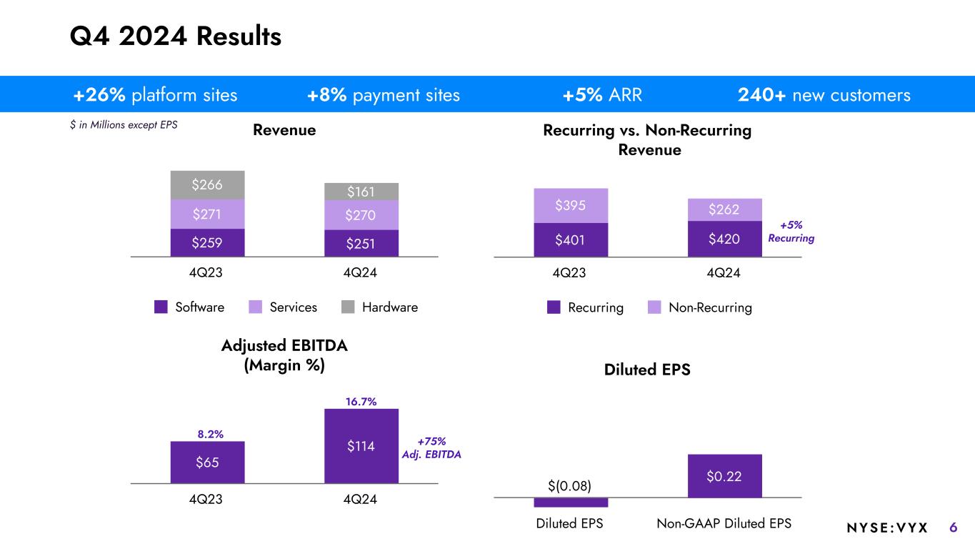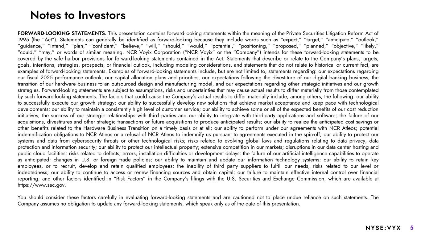 5NYSE :VYX FORWARD-LOOKING STATEMENTS. This presentation contains forward-looking statements within the meaning of the Private Securities Litigation Reform Act of 1995 (the “Act”). Statements can generally be identified as forward-looking because they include words such as “expect,” “target,” “anticipate,” “outlook,” “guidance,” “intend,” “plan,” “confident,” “believe,” “will,” “should,” “would,” “potential,” “positioning,” “proposed,” “planned,” “objective,” “likely,” “could,” “may,” or words of similar meaning. NCR Voyix Corporation (“NCR Voyix” or the “Company”) intends for these forward-looking statements to be covered by the safe harbor provisions for forward-looking statements contained in the Act. Statements that describe or relate to the Company’s plans, targets, goals, intentions, strategies, prospects, or financial outlook, including modeling considerations, and statements that do not relate to historical or current fact, are examples of forward-looking statements. Examples of forward-looking statements include, but are not limited to, statements regarding: our expectations regarding our fiscal 2025 performance outlook, our capital allocation plans and priorities, our expectations following the divestiture of our digital banking business, the transition of our hardware business to an outsourced design and manufacturing model, and our expectations regarding other strategic initiatives and our growth strategies. Forward-looking statements are subject to assumptions, risks and uncertainties that may cause actual results to differ materially from those contemplated by such forward-looking statements. The factors that could cause the Company’s actual results to differ materially include, among others, the following: our ability to successfully execute our growth strategy; our ability to successfully develop new solutions that achieve market acceptance and keep pace with technological developments; our ability to maintain a consistently high level of customer service; our ability to achieve some or all of the expected benefits of our cost reduction initiatives; the success of our strategic relationships with third parties and our ability to integrate with third-party applications and software; the failure of our acquisitions, divestitures and other strategic transactions or future acquisitions to produce anticipated results; our ability to realize the anticipated cost savings or other benefits related to the Hardware Business Transition on a timely basis or at all; our ability to perform under our agreements with NCR Atleos; potential indemnification obligations to NCR Atleos or a refusal of NCR Atleos to indemnify us pursuant to agreements executed in the spin-off; our ability to protect our systems and data from cybersecurity threats or other technological risks; risks related to evolving global laws and regulations relating to data privacy, data protection and information security; our ability to protect our intellectual property; extensive competition in our markets; disruptions in our data center hosting and public cloud facilities; risks related to defects, errors, installation difficulties or development delays; the failure of our artificial intelligence capabilities to operate as anticipated; changes in U.S. or foreign trade policies; our ability to maintain and update our information technology systems; our ability to retain key employees, or to recruit, develop and retain qualified employees; the inability of third party suppliers to fulfill our needs; risks related to our level or indebtedness; our ability to continue to access or renew financing sources and obtain capital; our failure to maintain effective internal control over financial reporting; and other factors identified in “Risk Factors” in the Company’s filings with the U.S. Securities and Exchange Commission, which are available at https://www.sec.gov. You should consider these factors carefully in evaluating forward-looking statements and are cautioned not to place undue reliance on such statements. The Company assumes no obligation to update any forward-looking statements, which speak only as of the date of this presentation. Notes to Investors