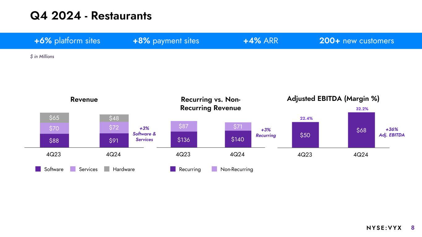 7NYSE :VYX Revenue $1,034 $988 $1,081 $1,067 $1,063 $771 Software Services Hardware 2023 2024 2024 Results $ in Millions except EPS Diluted EPS $(1.50) Diluted EPS Non-GAAP Diluted EPS Adjusted EBITDA (Margin %) $337 $347 2023 2024 Recurring vs. Non-Recurring Revenue $1,617 $1,634 $1,561 $1,192 Recurring Non-Recurring 2023 2024 10.6% 12.3% +1% Recurring +3% Adj. EBITDA $(0.13) +26% platform sites +8% payment sites +5% ARR 1,000+ new customers