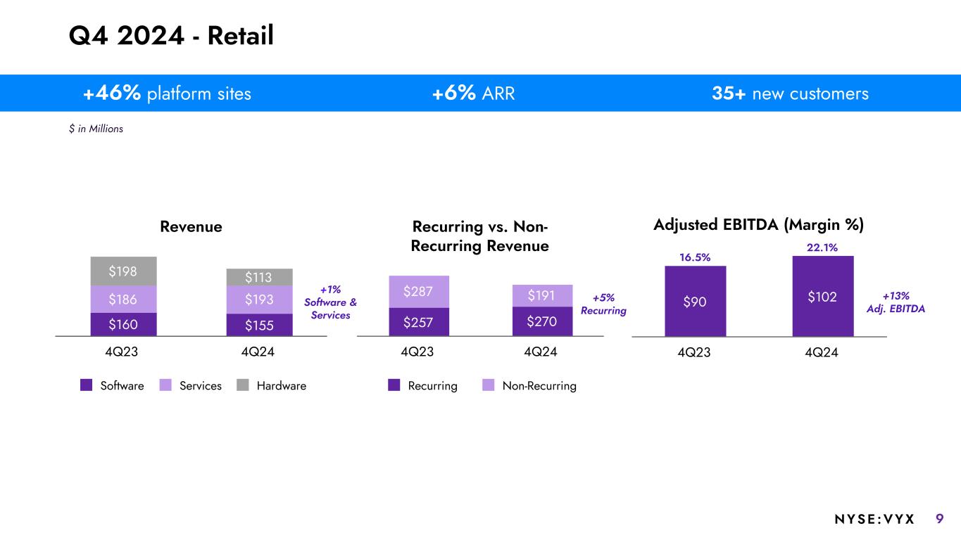 8NYSE :VYX Q4 2024 - Restaurants Revenue $88 $91 $70 $72 $65 $48 Software Services Hardware 4Q23 4Q24 Adjusted EBITDA (Margin %) $50 $68 4Q23 4Q24 Recurring vs. Non- Recurring Revenue $136 $140 $87 $71 Recurring Non-Recurring 4Q23 4Q24 +3% Software & Services +3% Recurring +36% Adj. EBITDA 32.2% 22.4% +6% platform sites +8% payment sites +4% ARR 200+ new customers $ in Millions